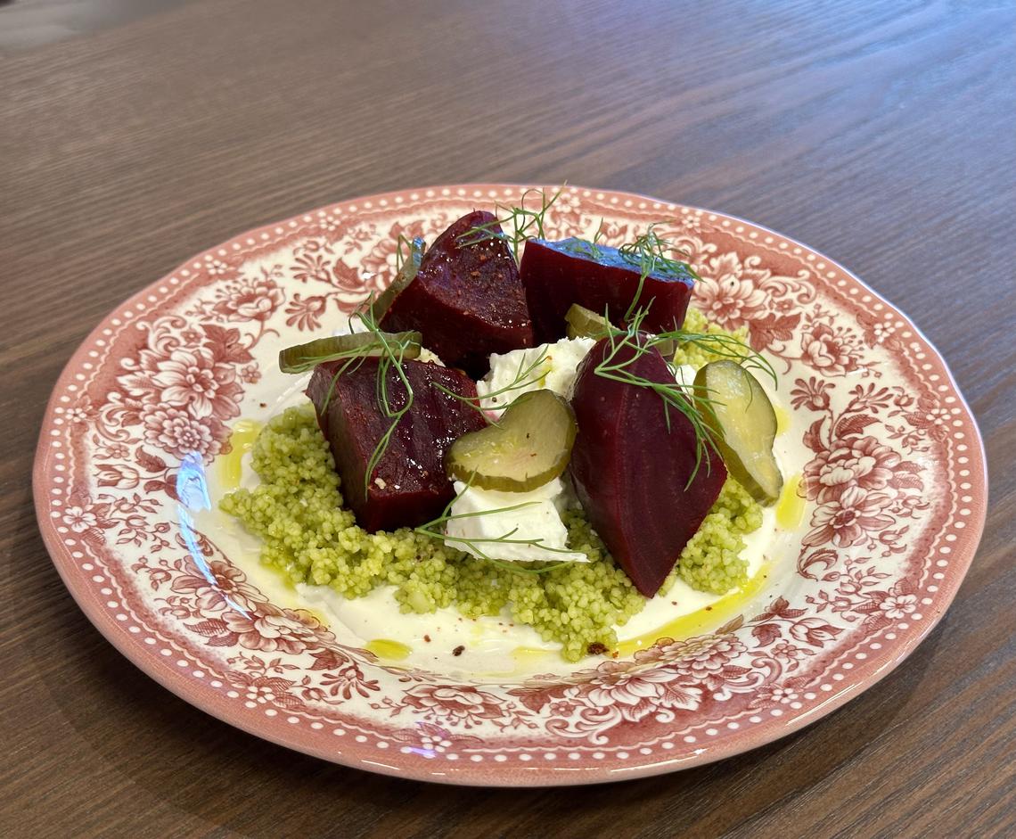 Hefty chunks of tender beetroot feature in a too-tart salad to start, tossed with feta cheese, pickles and a bit of couscous. But it gets the appetite going.