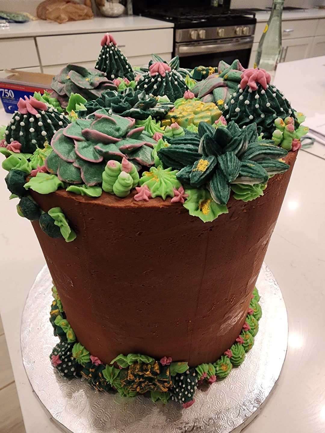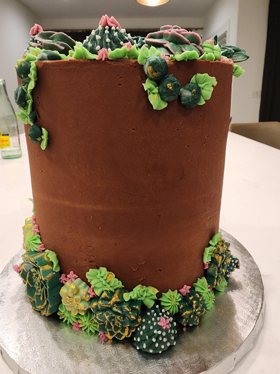 I made this for my office. The bright green isn't that bright, my camera brightened it up. I had fun, learned a lot. Buttercream and candy succulents, chocolate frosted cake.
