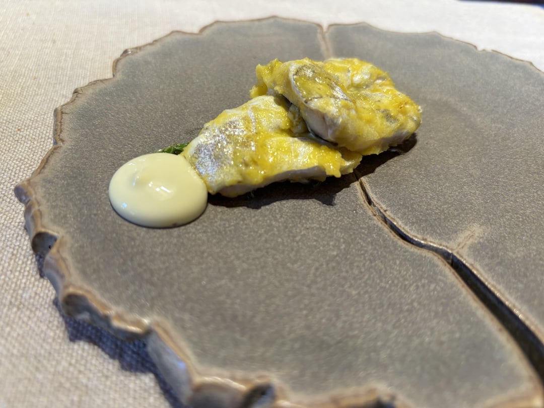 Battered and grilled cod throat with grilled Piparras peppers and aioli