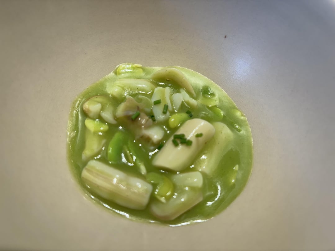 Razor clams with Fava beans in a terrific green pil-pil like sauce