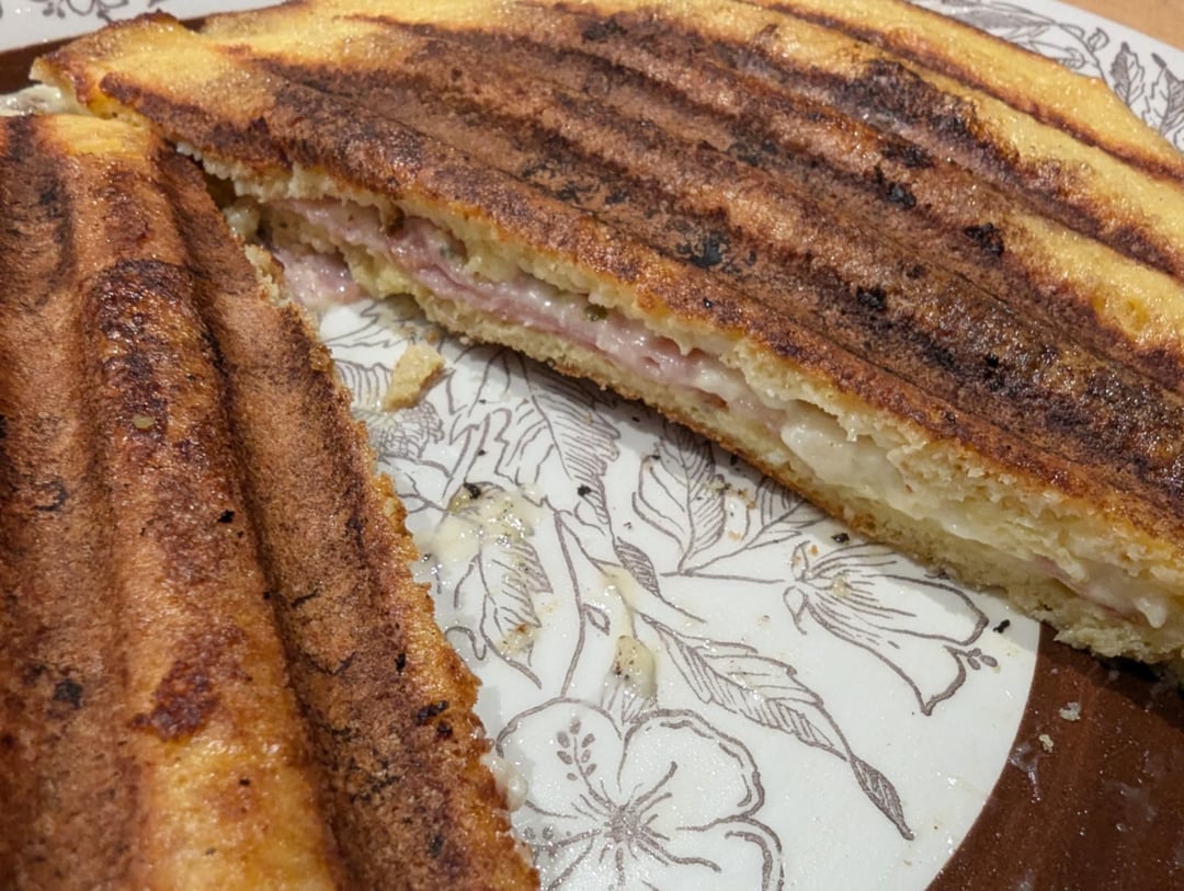 I made two pieces of bread (so I doubled the recipe), then egg washed, and just added cheese and ham inside and cooked inside my electric grill just long enough to melt the cheese (hence the grill marks).