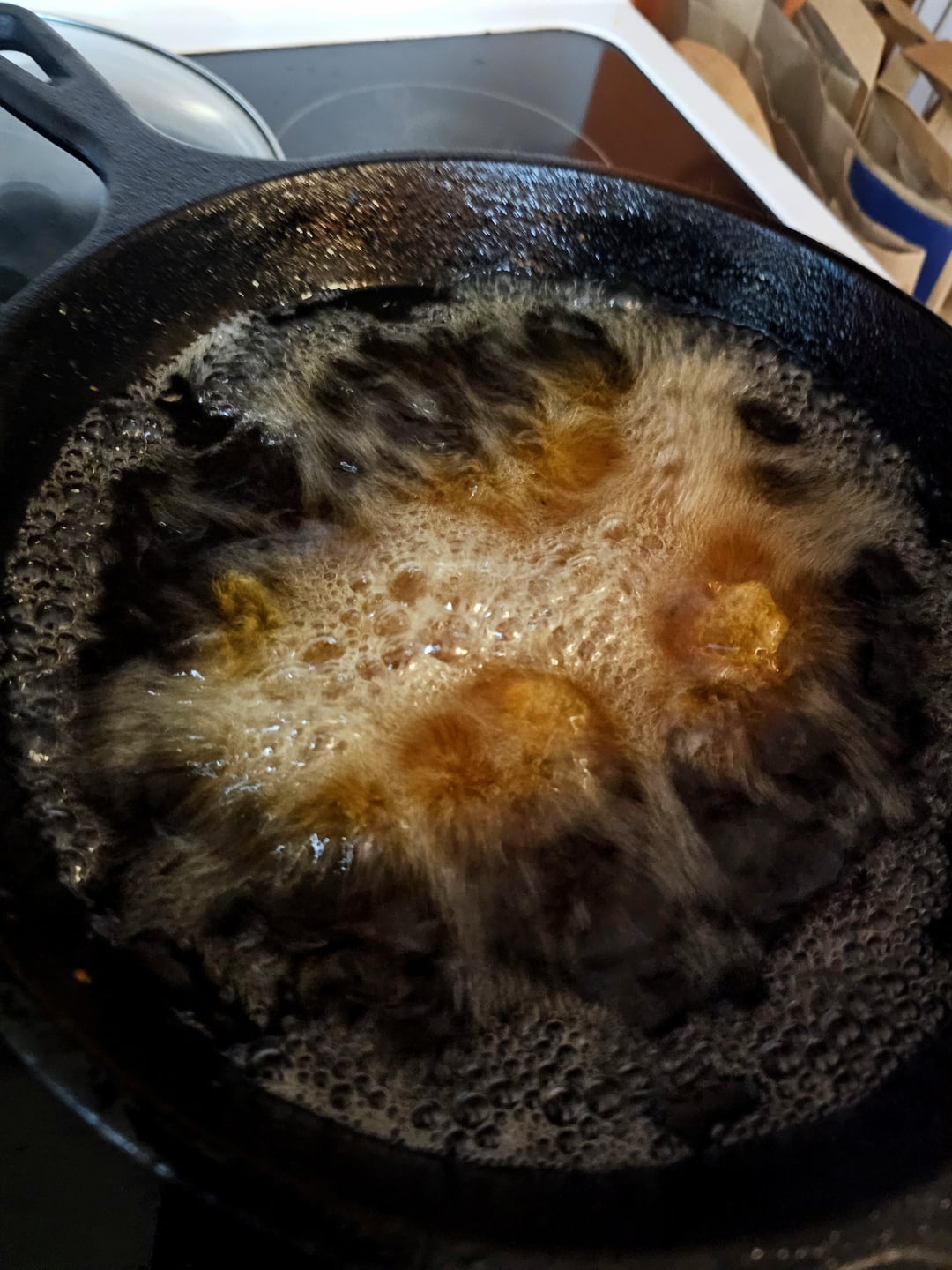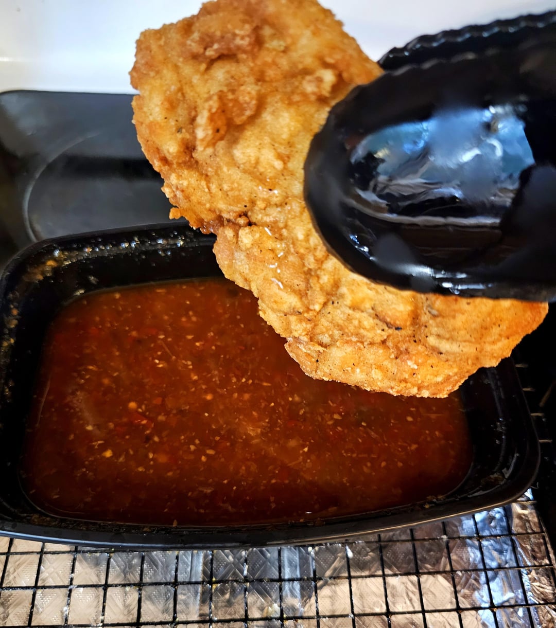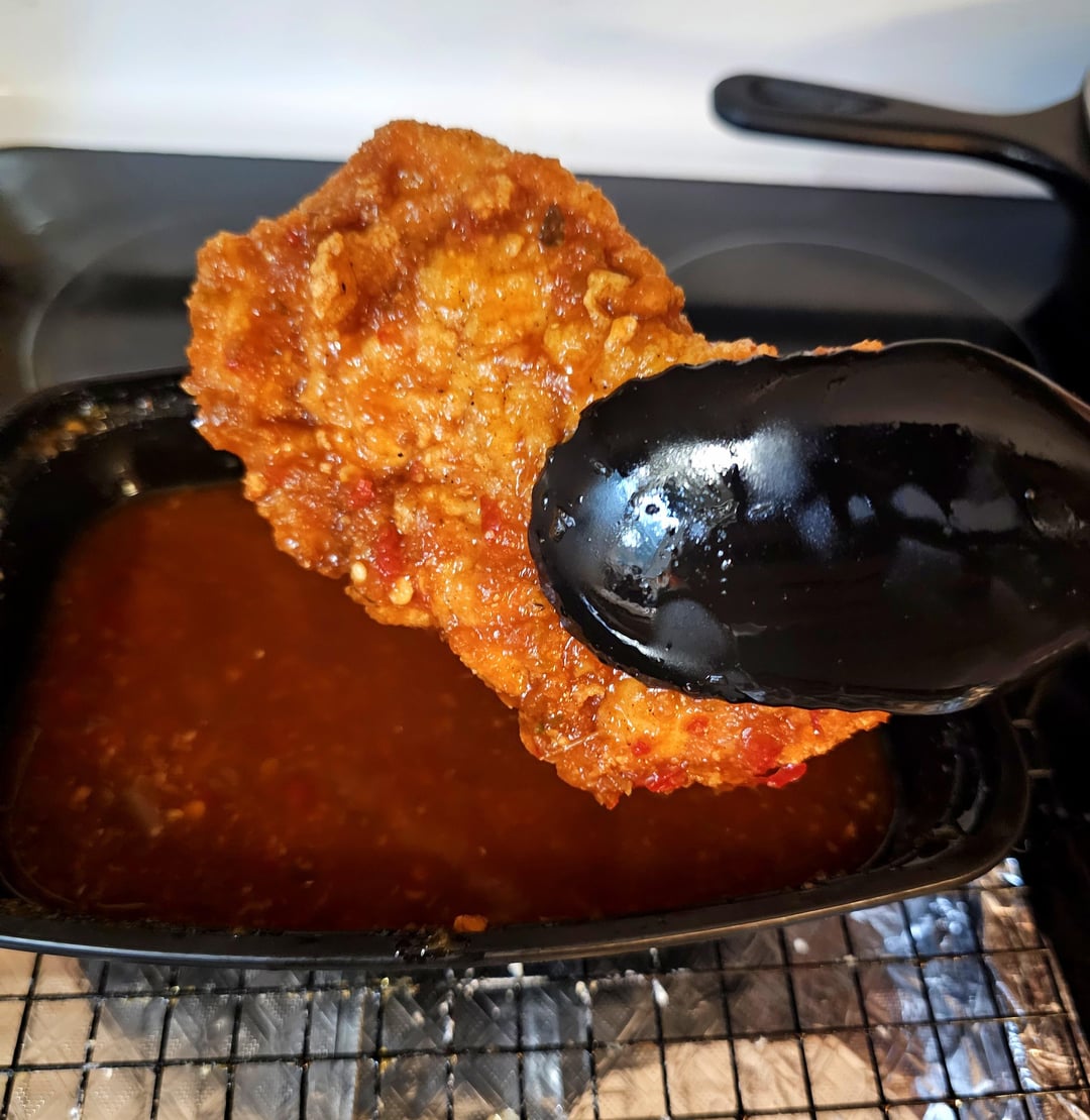 This was pretty quick and simple, chicken dipped in cornstartch then fried until crispy and double dipped in hot sauce.