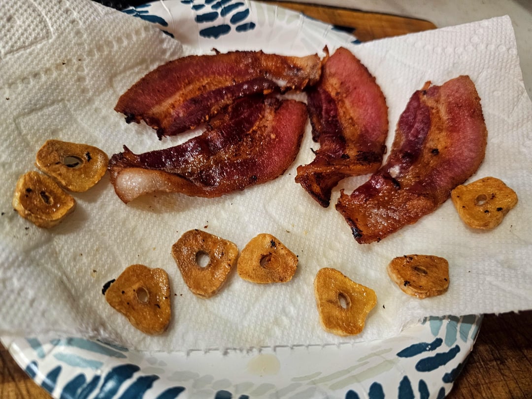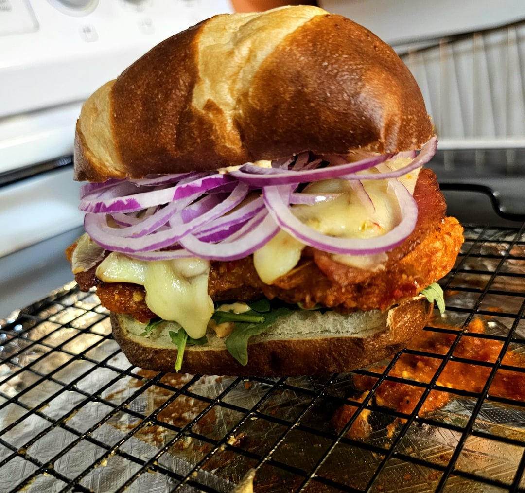 Pretzel bun, bacon, fried garlic, red onions, pepperjack, arugula, and for some homemade chipotle ranch, 50/50 mayo/sour cream, and adjust the rest to taste…salt, pepper, garlic powder, onion powder, dill, chives, lemon juice, and chipotles in adobo sauce…I used mostly the sauce part which also helped thin this to the consistency I wanted without having to add buttermilk.