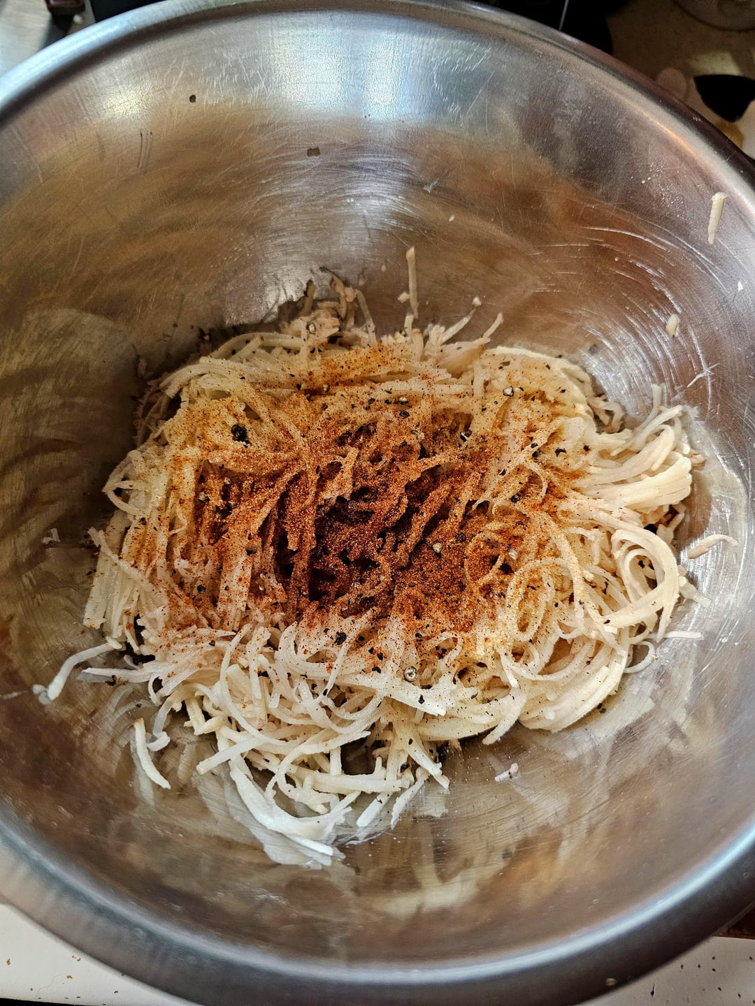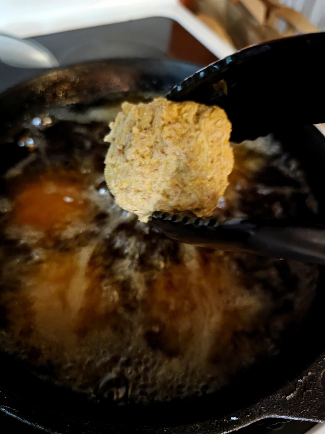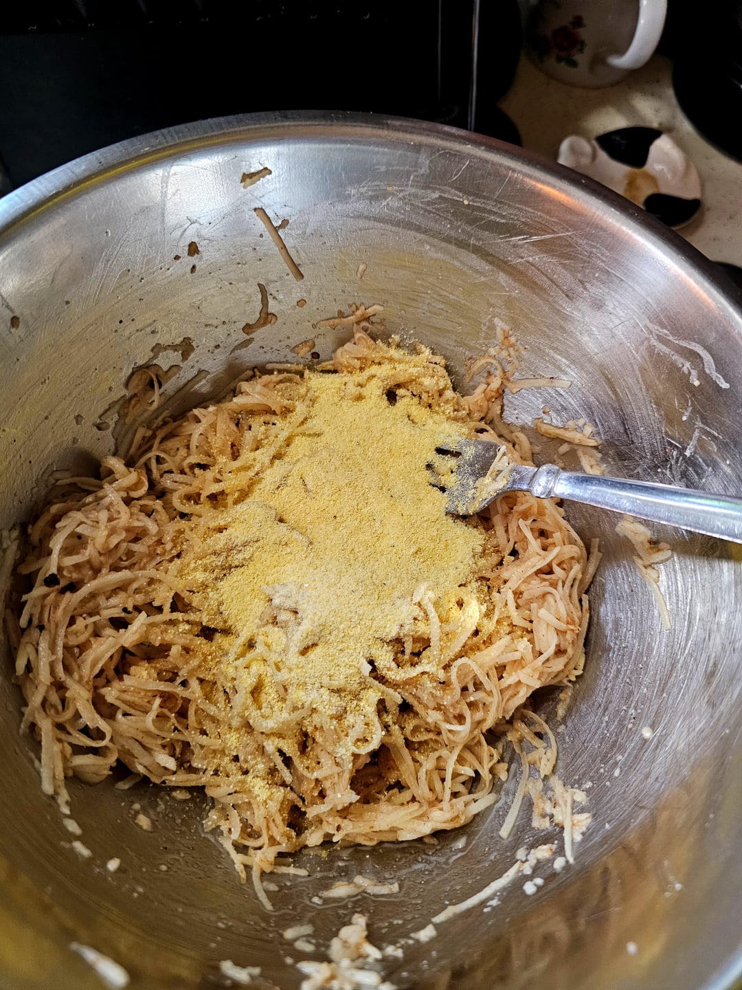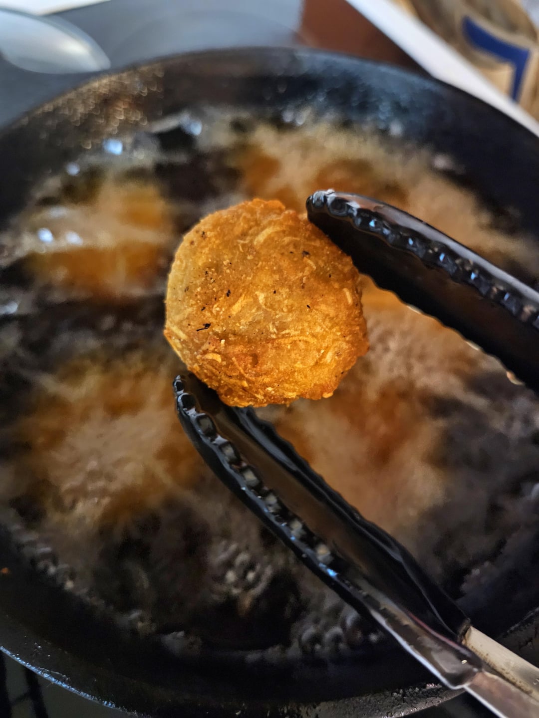 The potato balls were shredded potatoes seasoned w/ SPPOG then mixed with corn meal and flour until balls could be formed, and fried until crispy.