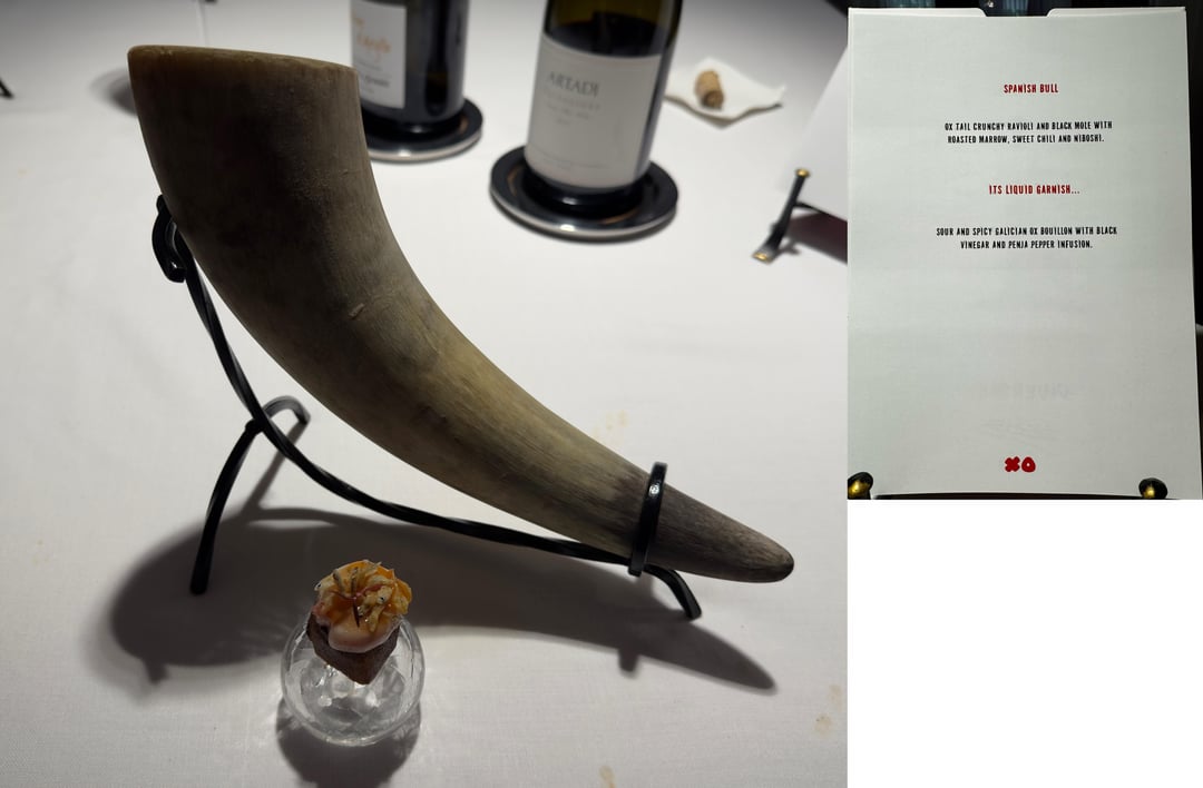 - First bite – Laksa Ox, Prawn. wow–best first bite. Incredibly rich flavors, most buttery and perfectly cooked prawn I've had. The crisp bite and subtle sea explosions from the roe. We knew we were in for a special meal.