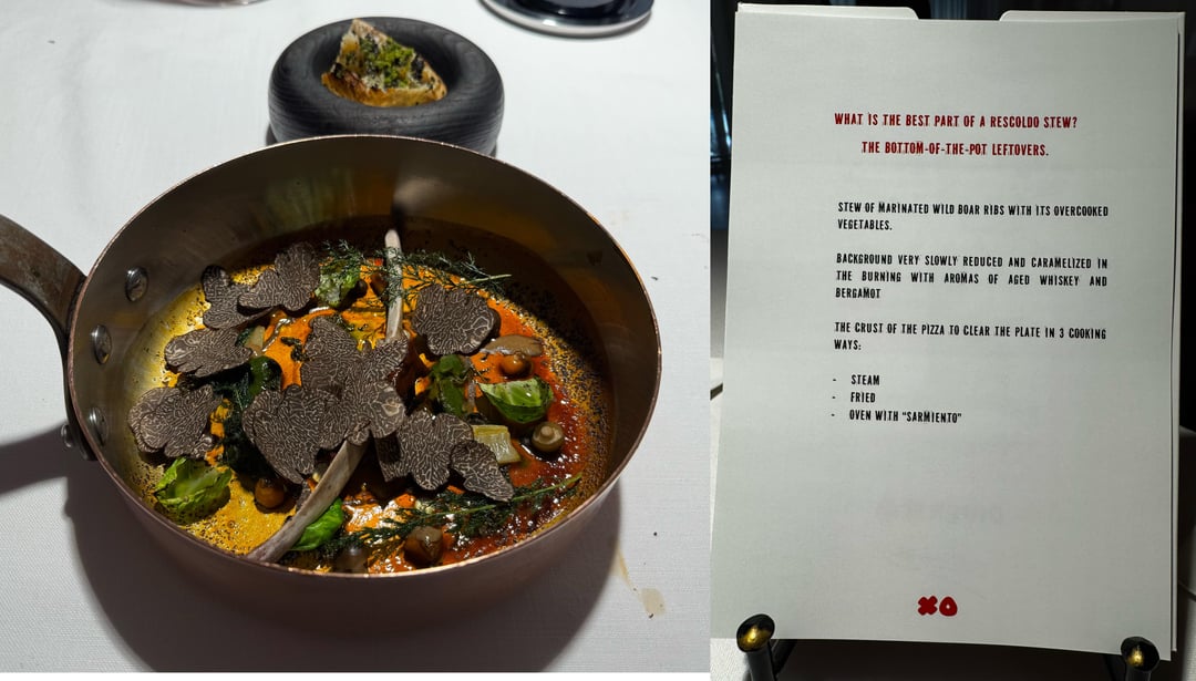 - Boar Rib stew and bread – incredible last savory bite. The bread was mind blowing–tasted just like a pizza coming out of an oven with char. My wife said the gluten free bread they made her was the best she's ever eaten.