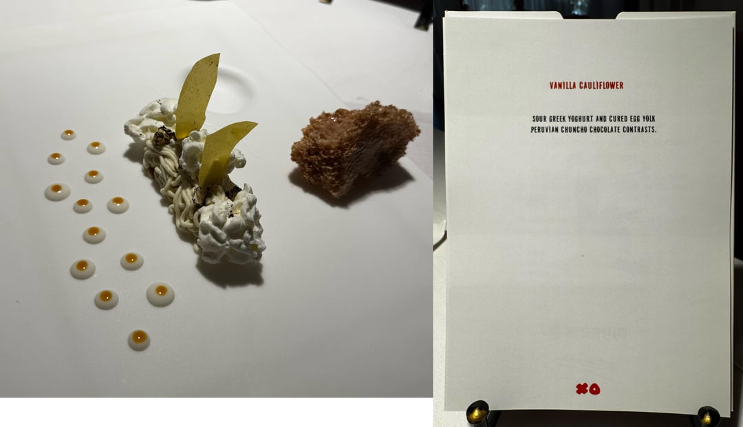 - All desserts nailed it… Cauliflower dessert – amazing balance, complex flavor combo, and texture of the chocolate "hive," the bubblegum dessert was a trip down memory lane–fun yet still adult and complex, and the Mochis were incredible.