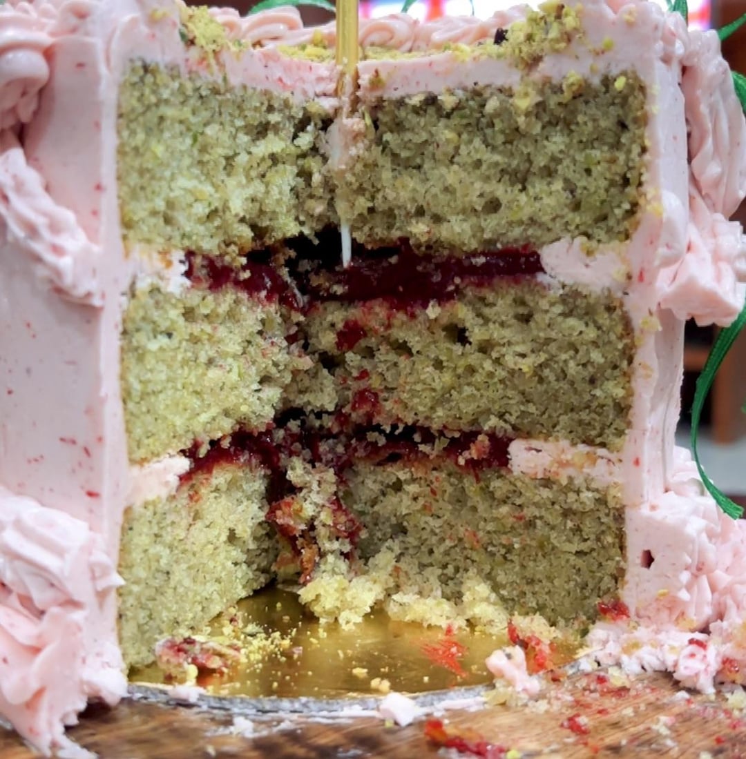 Here’s the recipe I followed: https://teakandthyme.com/raspberry-pistachio-cake/