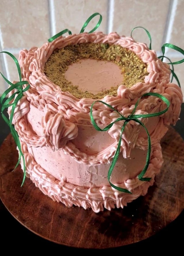 The pistachio sponge turned out really soft, and I filled the layers with raspberry jam and frosted the whole cake with raspberry buttercream. I followed the recipe from Teak & Thyme.