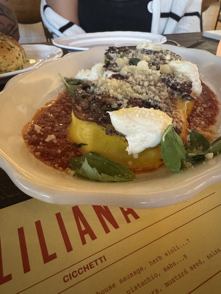 You can’t miss the rotolo, which is a lasagna-inspired classic Italian dish, made famous by the New York City restaurant Don Angie. Liliana’s version costs just $24 and is made with a noodle rolled pinwheel-style in a circle, filled with ricotta, mozzarella, fontina, whipped cream cheese, and spinach, then bathed with arrabbiata sauce. The whole thing is then charred on top to give a little smoke, a little crunch, and a major wow.