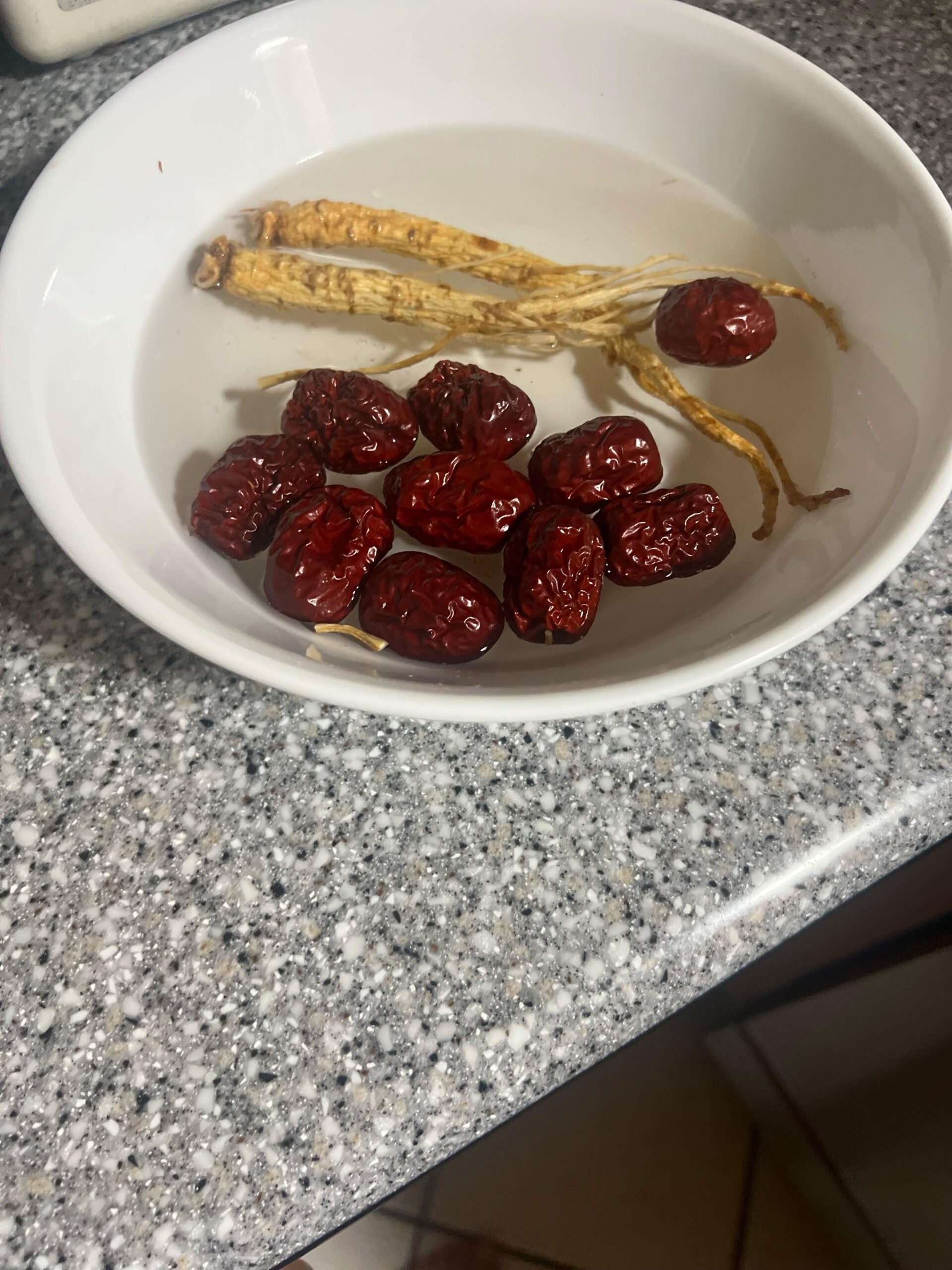 Everyone guessed right… as to recipe this one has more medicinal herbs added. My cousin runs a samgyetang restaurant in Korea. They sent us a bunch of stuff. The broth probably slightly more bitter than regular samgyetang. Plus this one has an oversized chicken to feed the family.