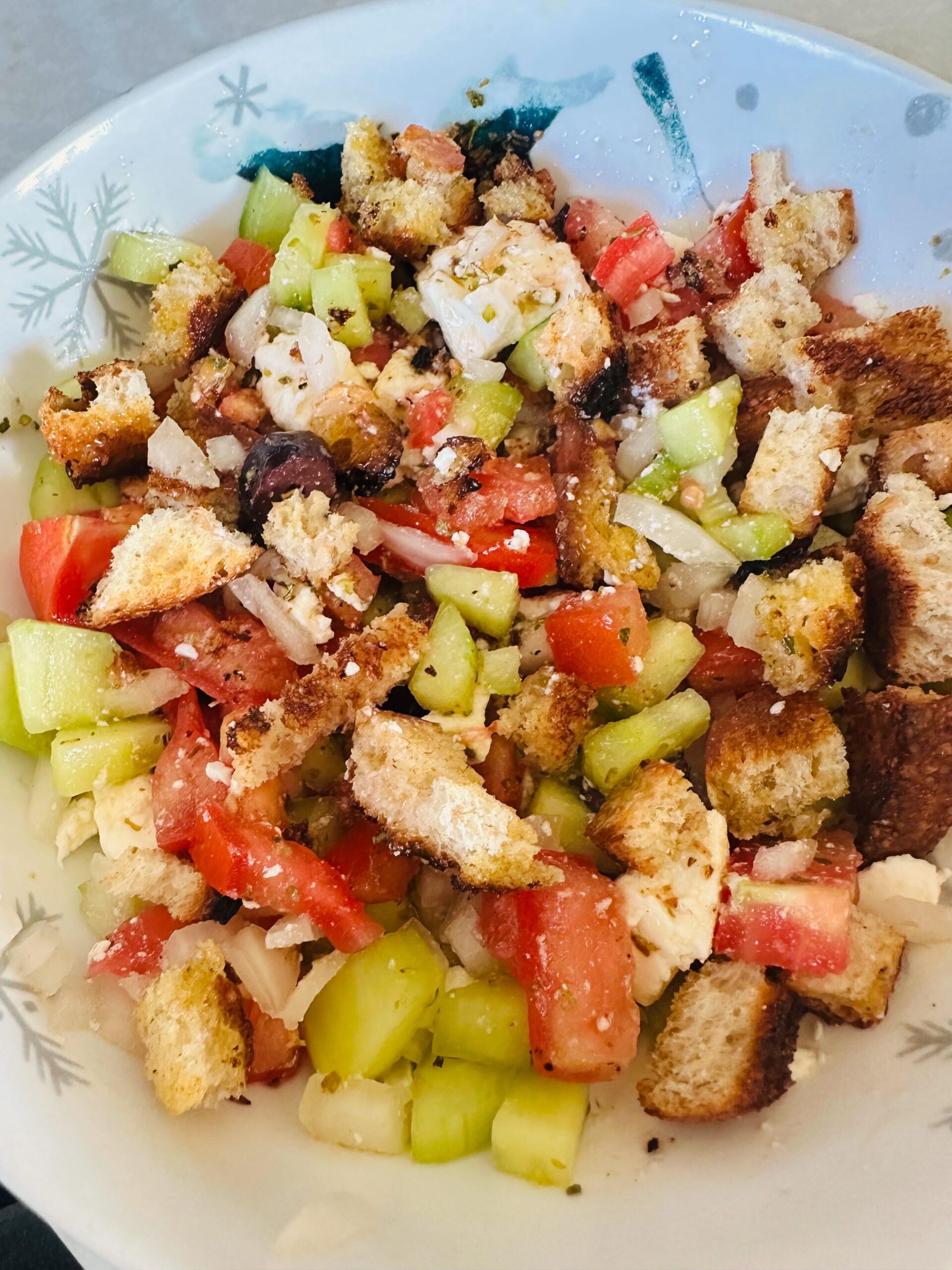 Chopped tomatoes, cucumber and onion, feta cheese, Kalamata, olives, French bread croutons, olive oil, oregano, salt, pepper, a little bit of garlic powder, and plenty of lemon juice.