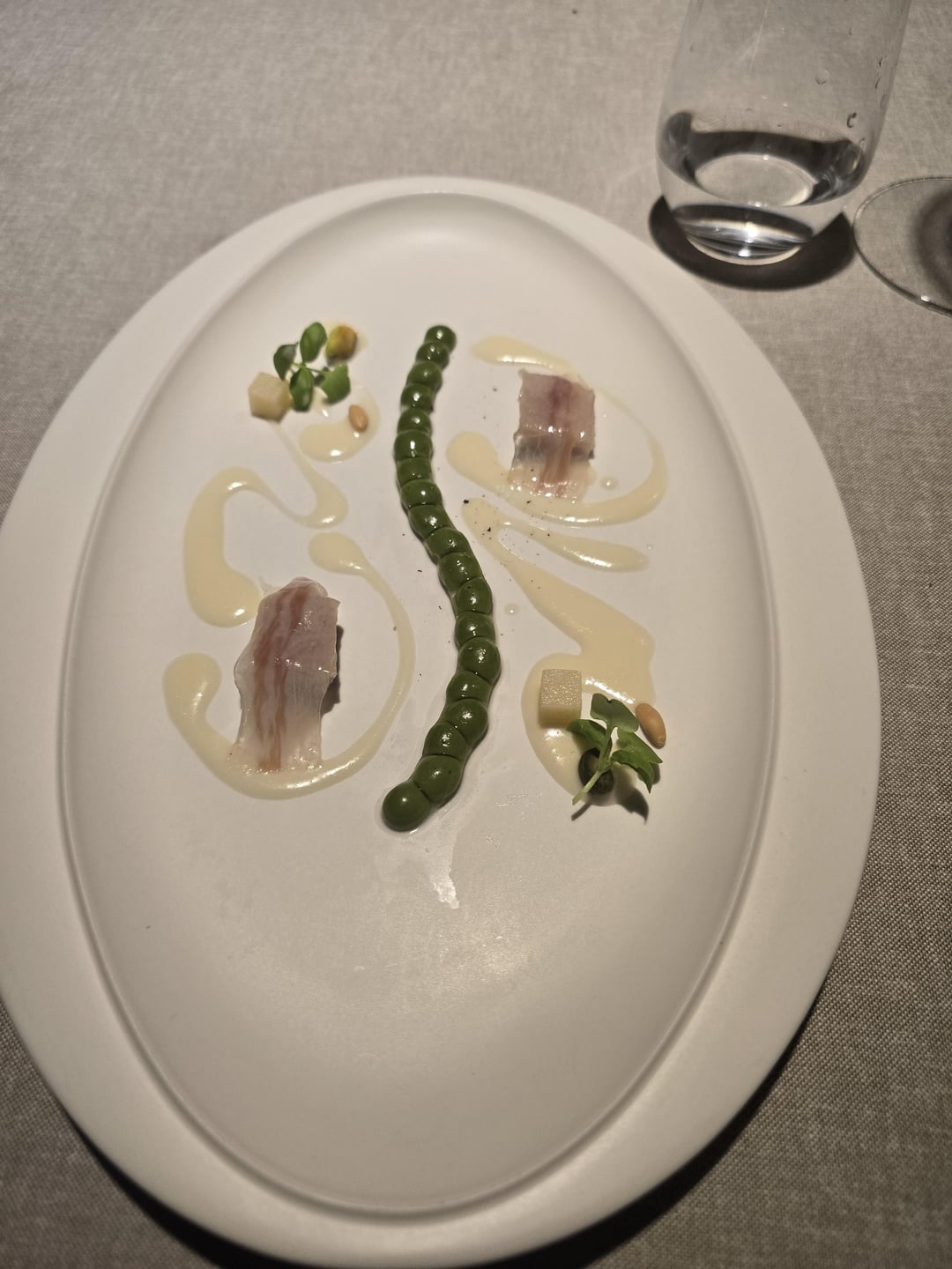 6)pesto spheres that pop almost, with smoked anguila, and a thin slice of papada ibérica on top, (thinly sliced iberian pork neck)