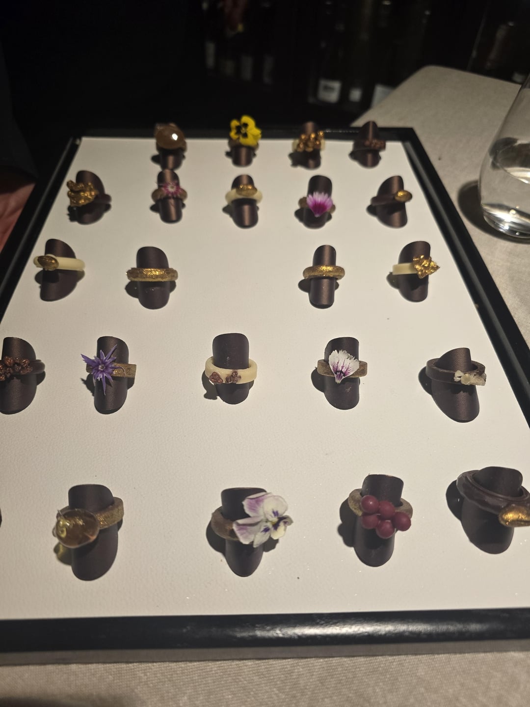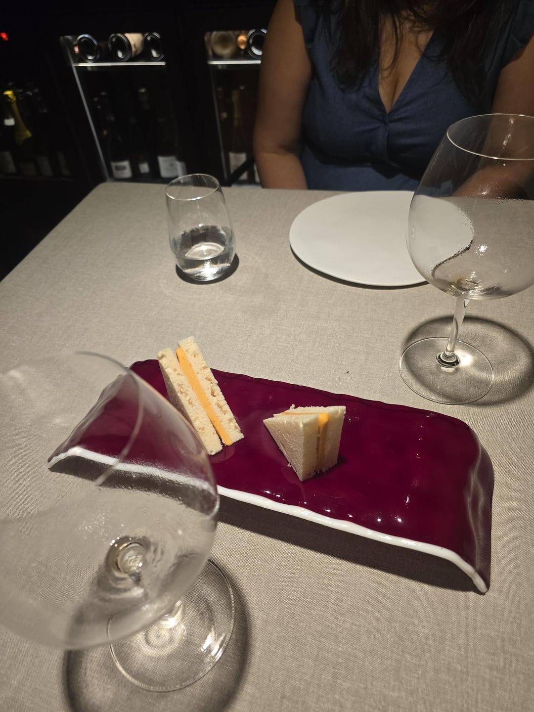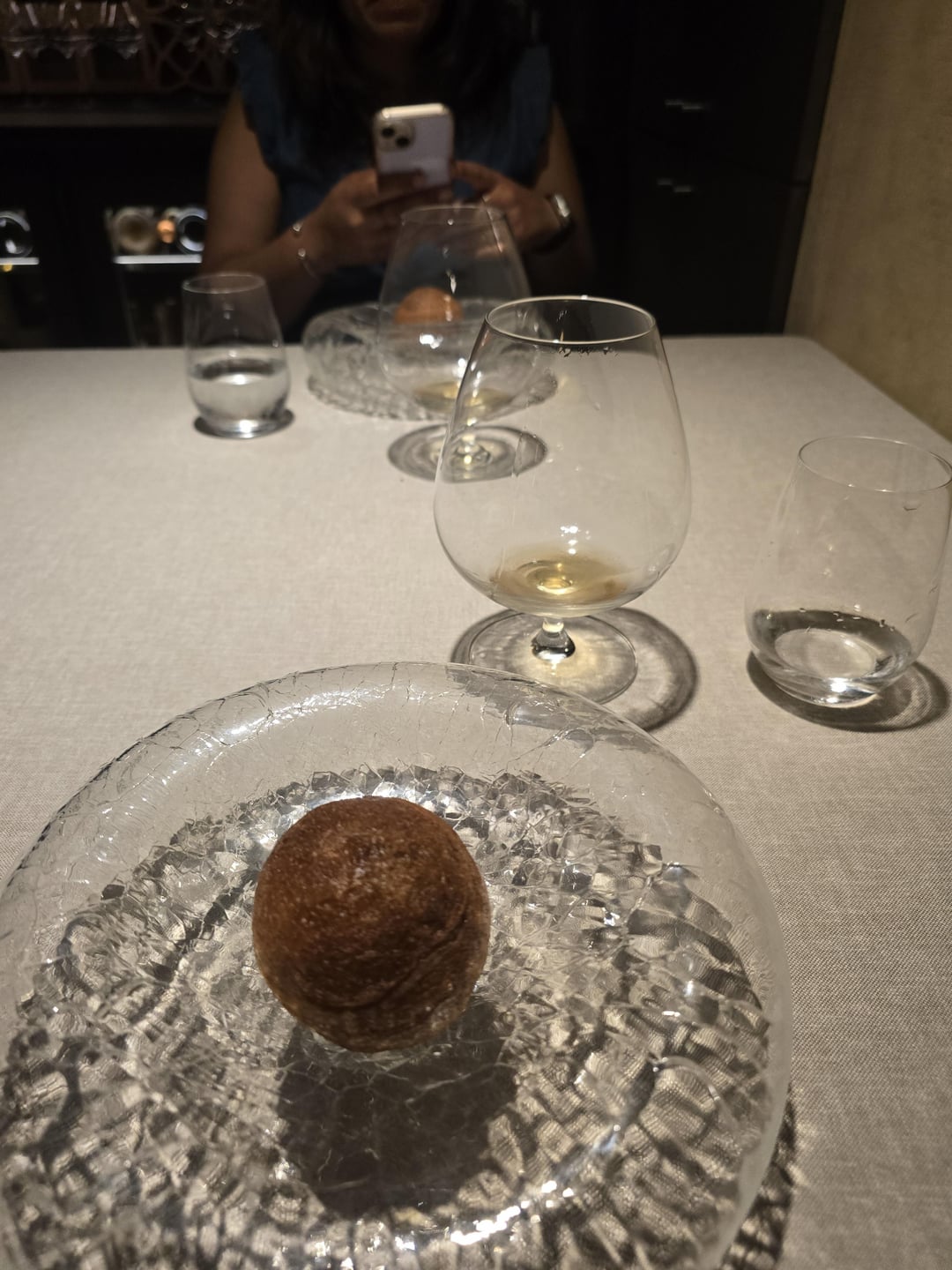 One point to nitpick (but not really) : our table – our table was one of the closest ones inside the door, after the dessert chef counter, they crammed in 3 tables parallel to the walkway to the main part of the restaurant, also we had the end of the 3 tables that they've put there, and there was a station with wine glasses right behind my girlfriend, so they kept swooping in and out and opening and closing it. Not a problem at all, but very different seating to any other 3 star I've been to. At first I thought it was where we would start with the welcome snacks before moving to the main part of the restaurant.