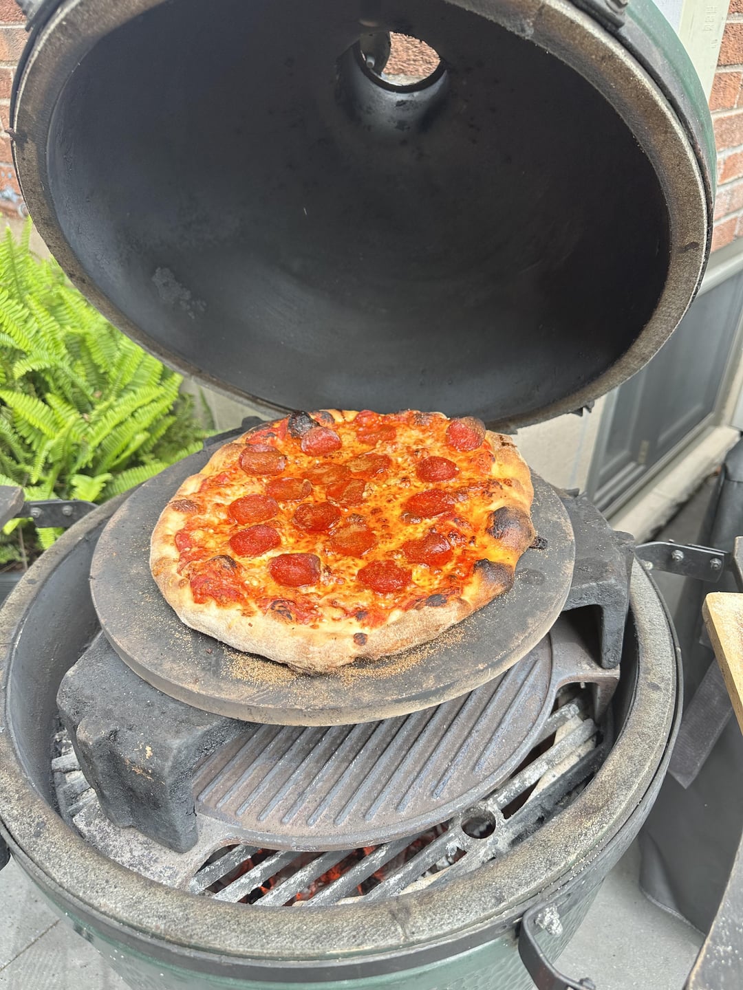Found this setup to work the best at around 600 degrees. Have to let the stone get hot for a bit first then cook for around 10 mins. Grill then two eggspander type things stacked. Cooks the top and bottom evenly.