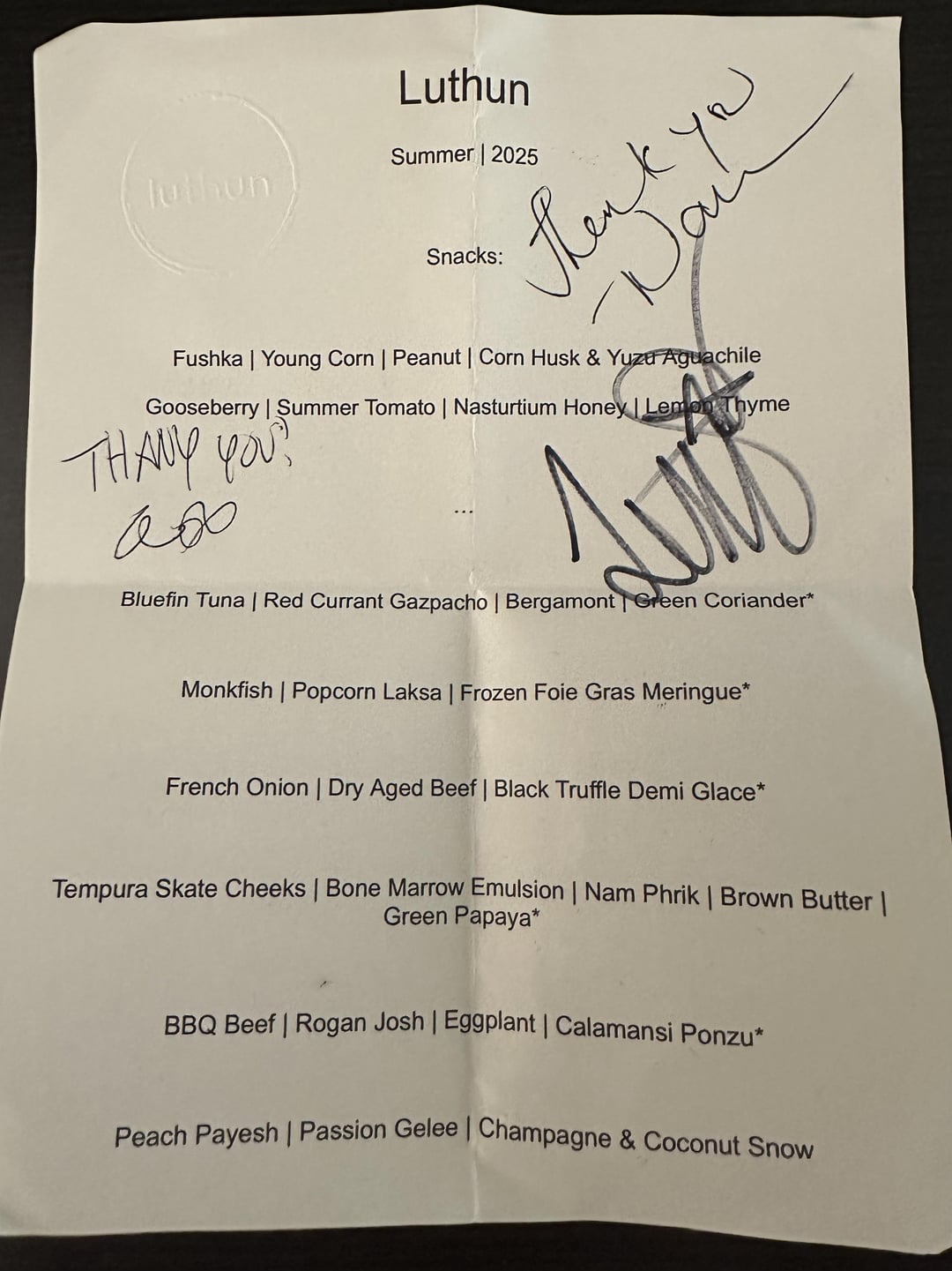 So I saw Luthun getting tons of love here and decided to check it out. This place absolutely did not disappoint. Excellent meal, excellent staff. Incredible this place doesn’t have a star, head and shoulders better than multiple 1 stars I’ve been to. Also a great value, menu was $150.
