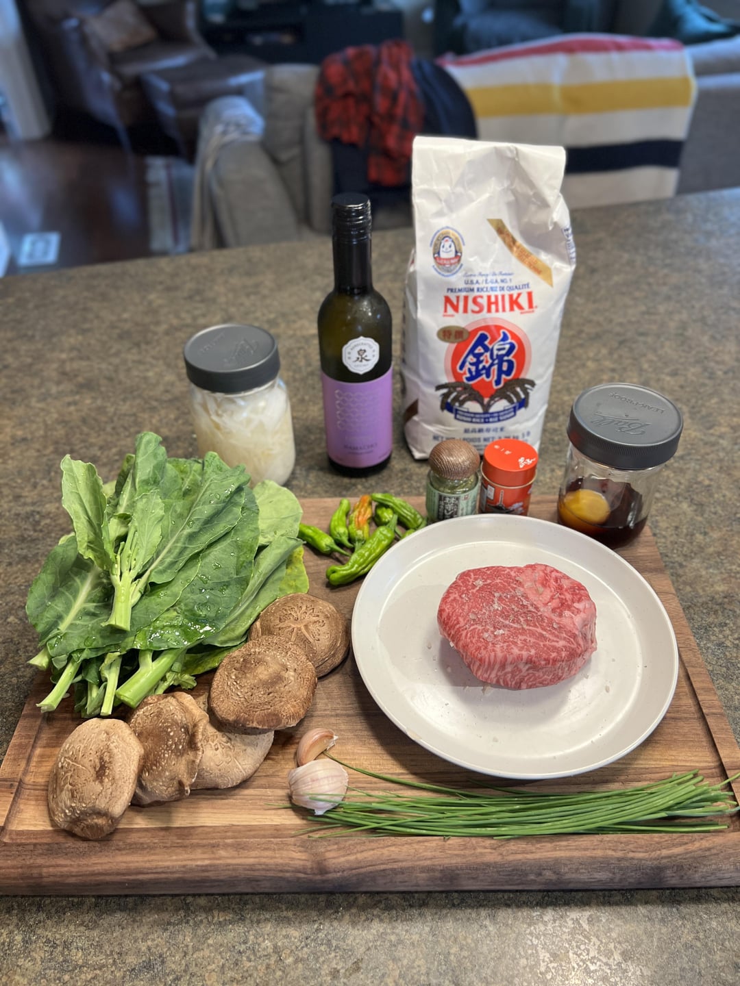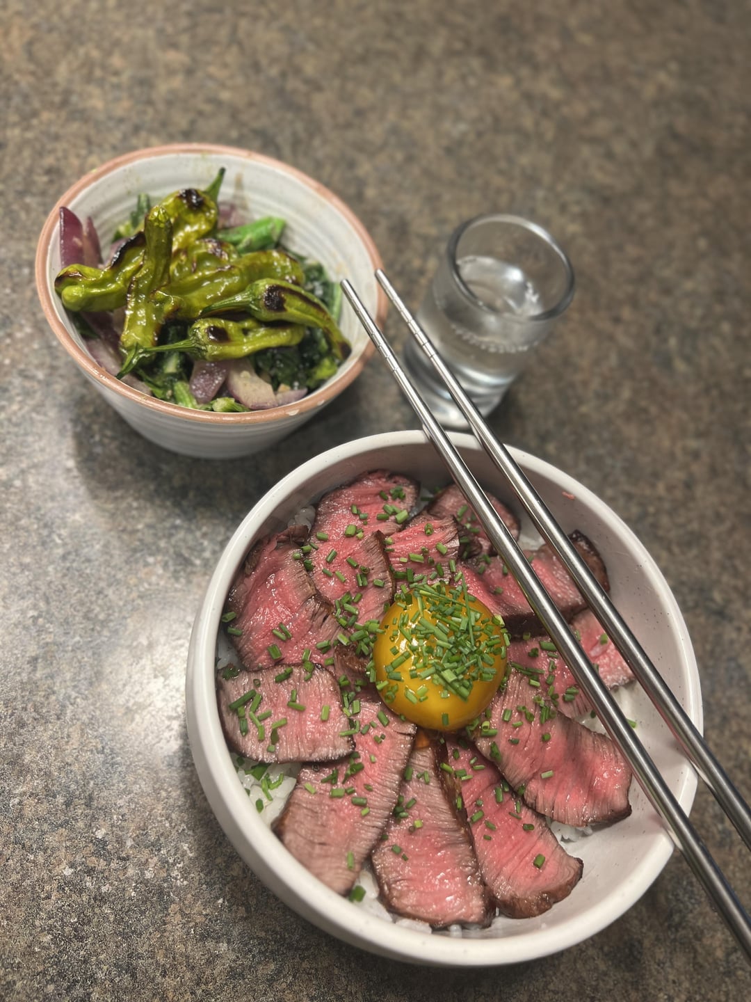 Just a cute little piece of wagyu. Fell apart a little. Reverse sear – brought it up then flipped it into cast iron for 2mins/side then kissed the grill. Topped with an egg yolk cured in soy/mirin/rice vinegar/brown sugar and chives from the garden. The shiitakes disappeared because they smelt kinda like sour beer, so I did the gai lan with red onion in miso garlic butter and blistered the shisitos next to the steak on the iron. What do we think?
