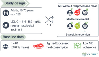 Graphical abstractCADIMED tests an 8-week Mediterranean diet excluding red/processed meat for CVD prevention. The study’s primary outcome is to assess changes in circulating LDL-C and fatty acid profile, alongside improving lipid profiles and reducing CVD risk through cost-effective dietary advice. Baseline data highlight low adherence to the MD and high red/processed meat consumption. CVD, cardiovascular disease; LDL-C, low-density lipoprotein cholesterol; MD, Mediterranean diet.