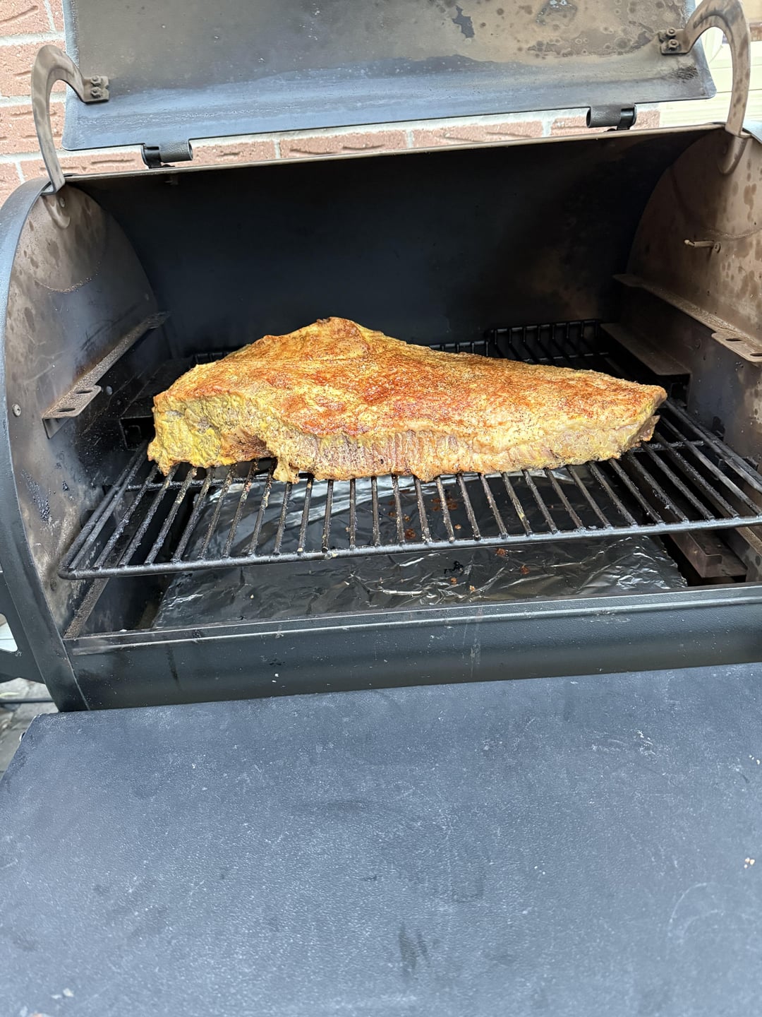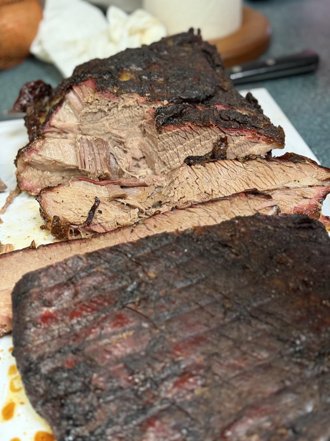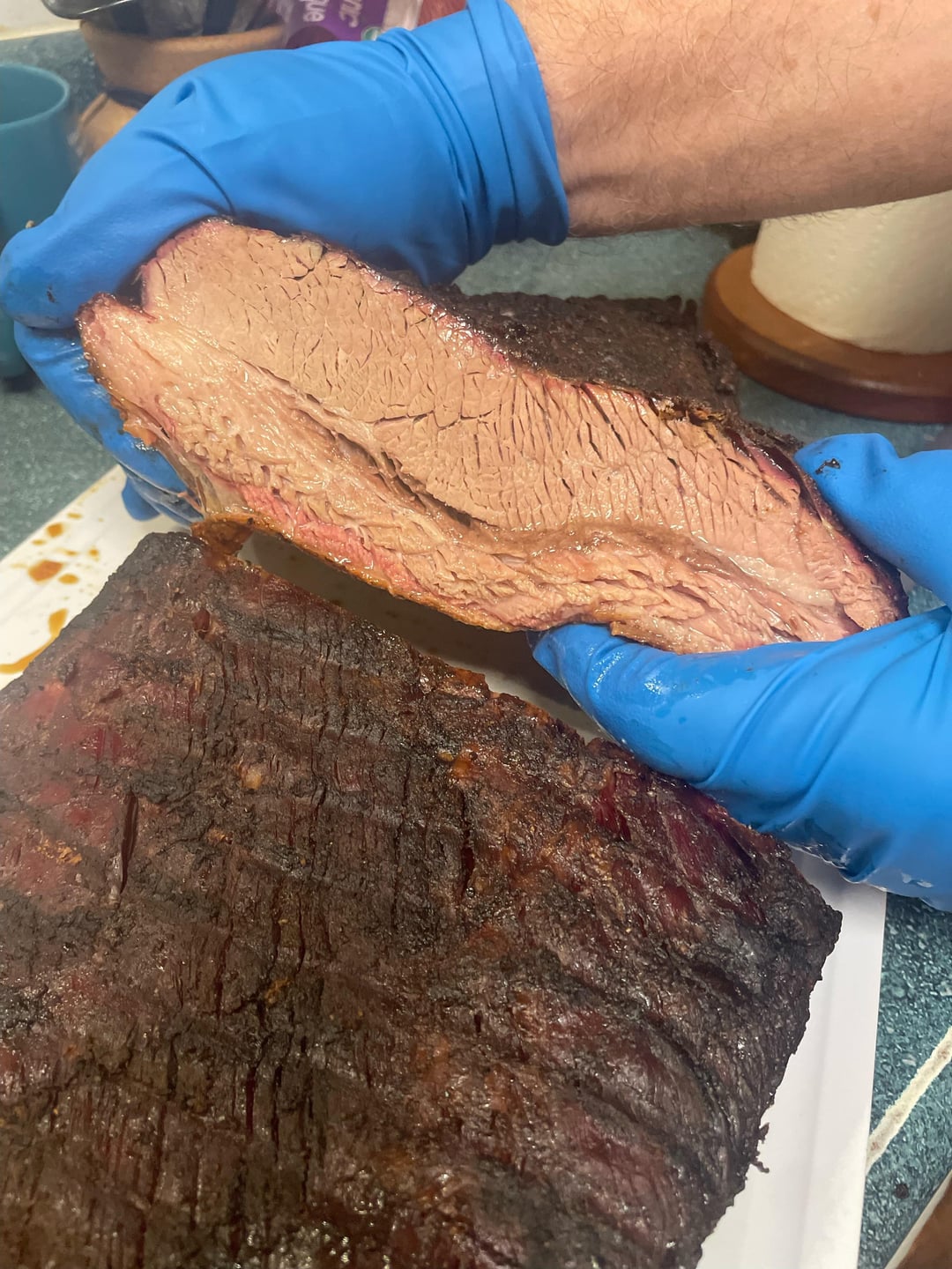 Very happy with my first brisket. Tender, juicy, and tons of flavour. I used Matt from Meat Church’s technique. It went on the Traeger at 8pm, at 200F. In the morning, around 8am, up to 220F until the interval temp was 170ish, then increased heat to 250F, and wrapped in butcher paper, and waited until 205F internal temp. That happened at about 315pm. Into a cheapo cooler until supper at about 630pm.
