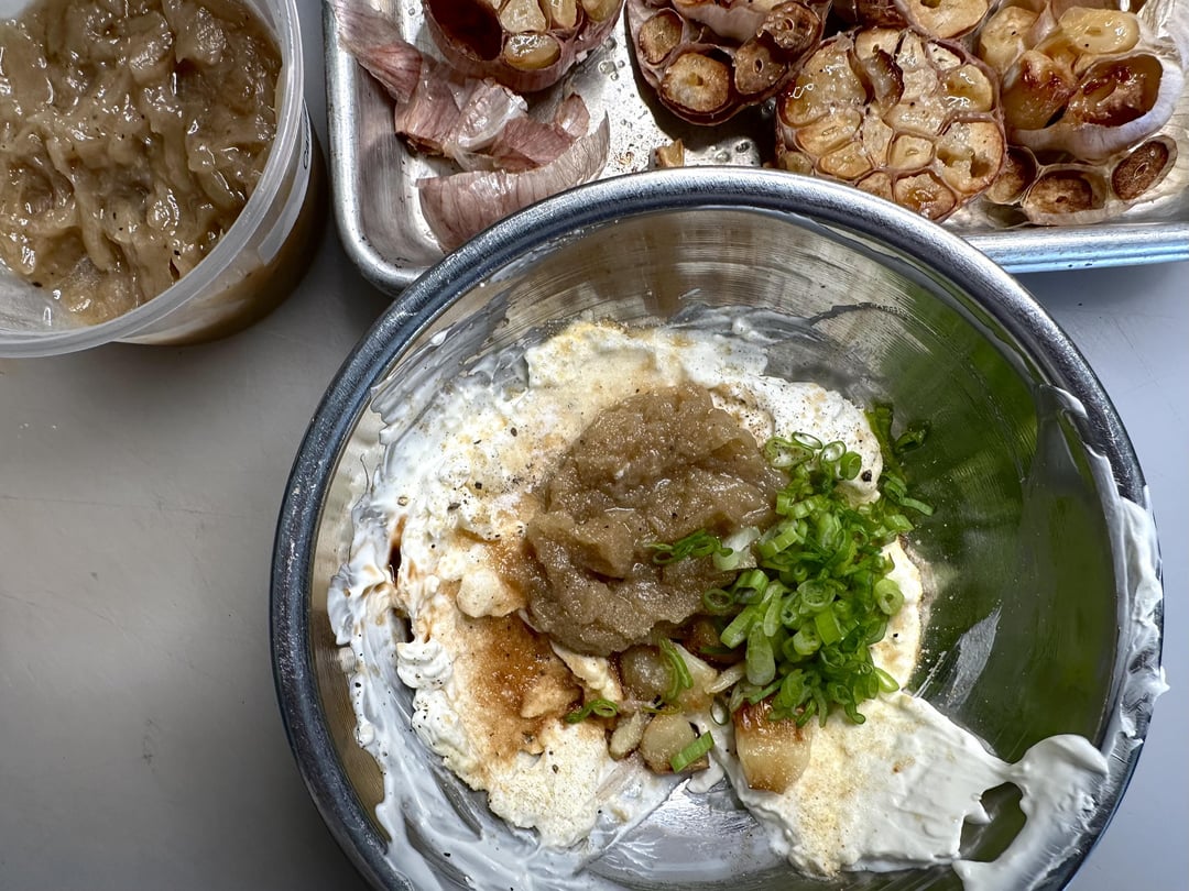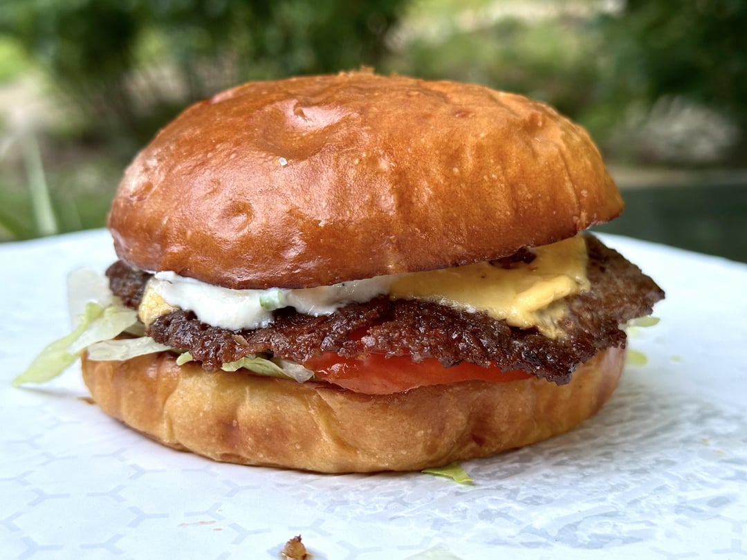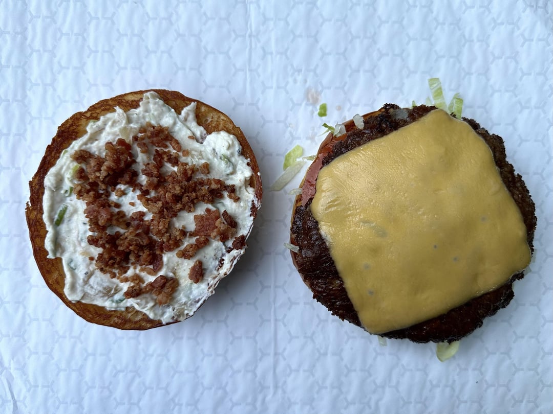 Burger night! This week’s special had home ground chuck and sirloin tip smash patties, yellow American and LoL Hot Pepper American, homemade roasted garlic and caramelized onion dip, bacon crumbles, and burger sauce, on a buttered and griddled homemade bun.