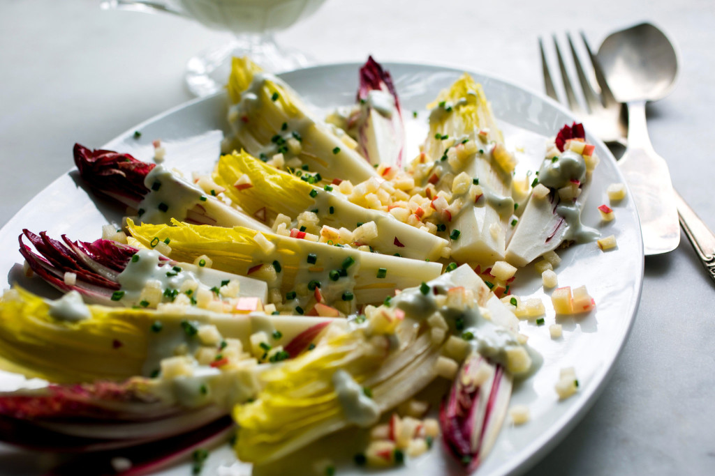 - Trim away the very end of the endives and cut lengthwise into quarters. Arrange on a platter or on individual plates and spoon on dressing. Top with chives and diced apple, and serve.