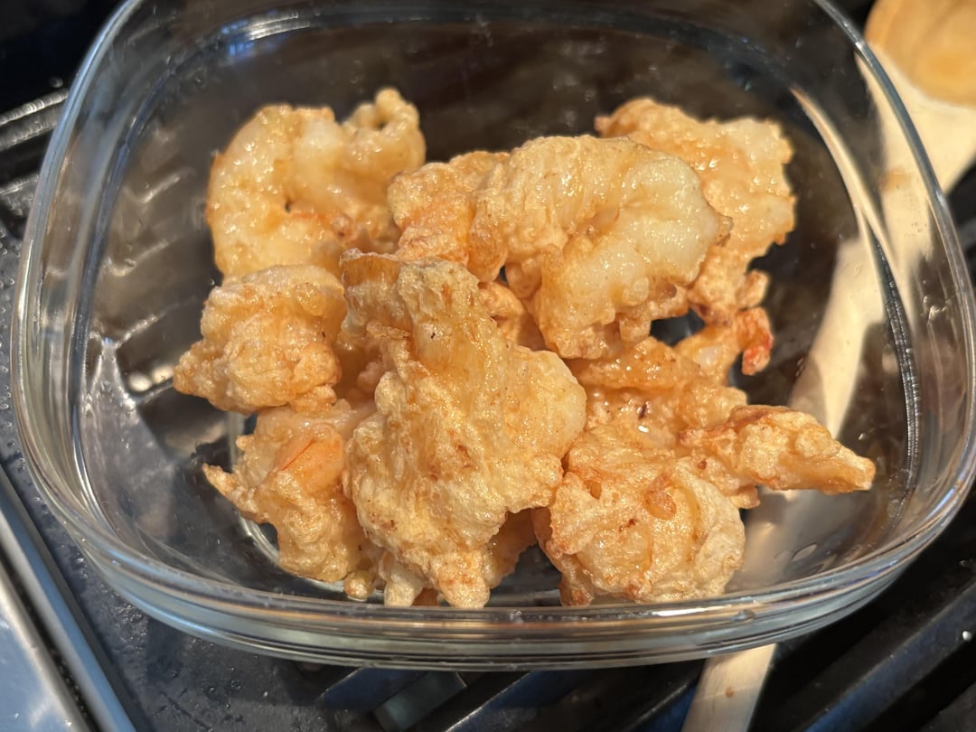 shrimp marinated in shaoshing, white pepper and garlic. Sauce was red tofu, mayo, soy, sesame, lao gan ma and garlic. Fried shrimp after tossing in egg white and cornstarch
