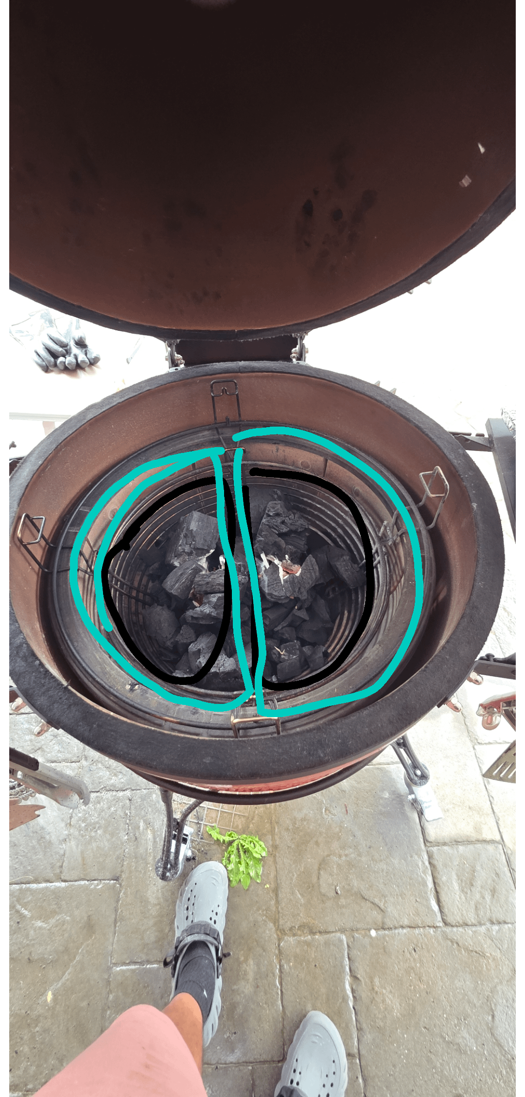 Black lines, though it’s fiddly to get them to sit on the four platform points, but that’s where they are supposed to go. They are too small to sit on the firebox so blue is a no go. I personally put the X Accessory thing on the bottom tier of the divide and conquer rack and sit them on that. It doesn’t smother the charcoal as much and I’ve not really found there to be much if any difference results wise.