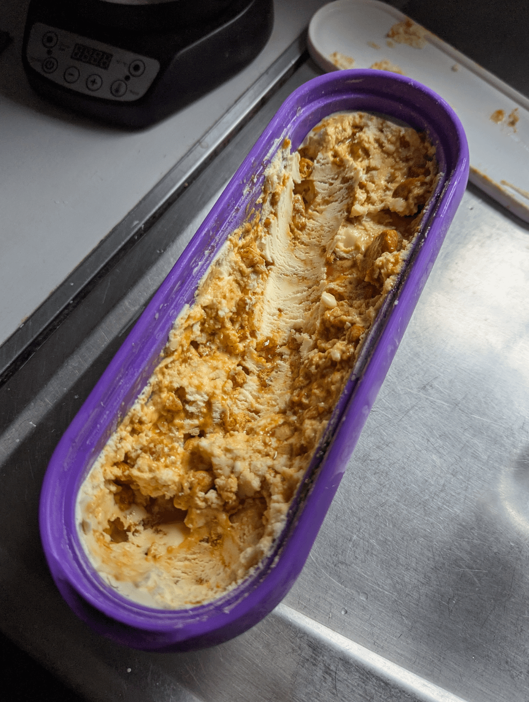 The fine candy powder is great, as it dissolves into the ice cream and leaves caramel ripples. The bigger pieces retain most of their texture from before mixing in, and though I was worried about how severely they might get stuck in/on teeth, they are manageable to eat and partly softened by the base. But definitely not a flavor recommended for somebody who has had recent dental work.