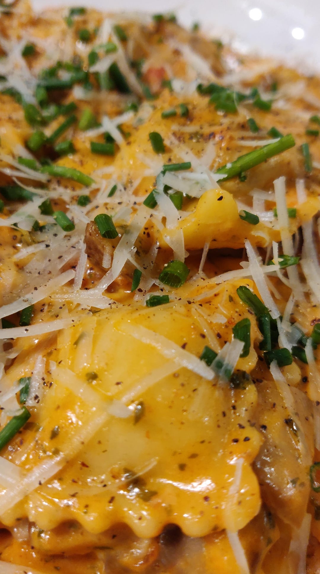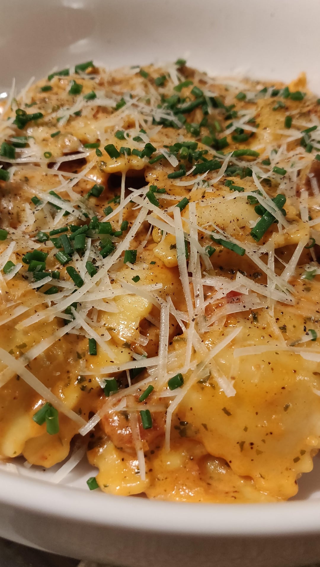 I love mixing beef & cheese raviolis. Always a pleasant suprise in mouth. Rosé sauce made with cream, tomato sauce, garlic, fresh parmigiano-regiano, salt, pepper, chives from yhe garden. Cooked only 1 to 2 minutes in boiling water and finished cooking in the sauce. So so good!