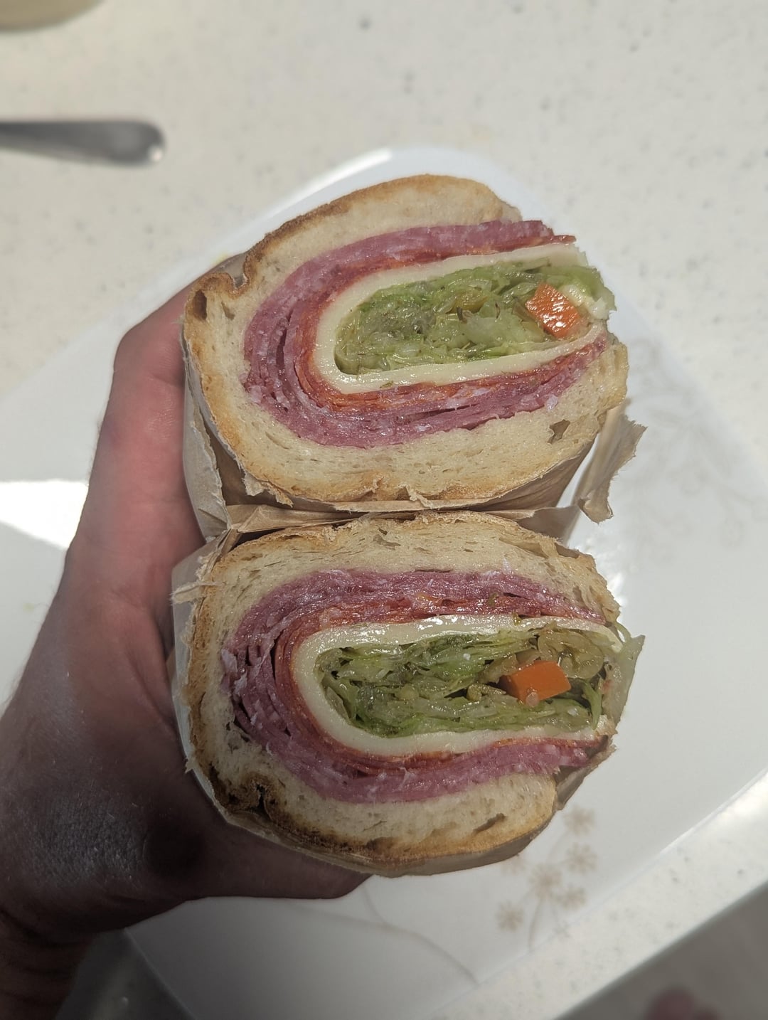 Geno salami, hot Calabrese, provolone, lettuce, hot Chicago style giardiniera, oil, and vinegar on French bread. All ingredients minus the giardiniera, oil, and vinegar are local.