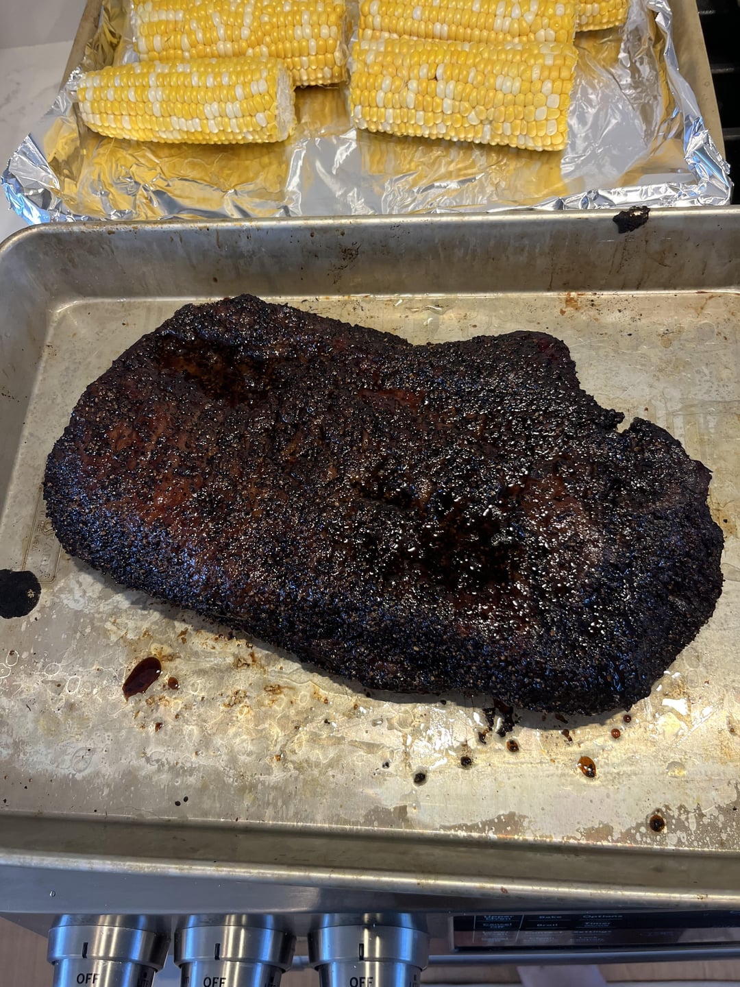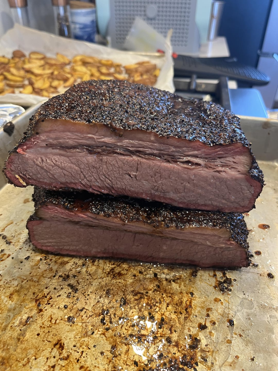 Smoked my first brisket this past weekend! 10 lbs pre-trim, seasoned with coarse black pepper and salt, mustard as a binder. Put on the Traeger Pro 22 at 180 at 8 pm Friday, cranked up to 225 around 2 am, then let it ride to the stall at 165 around 6 am. Wrapped at 165, bumped up heat to 250, then let it go to 201 when I pulled it.