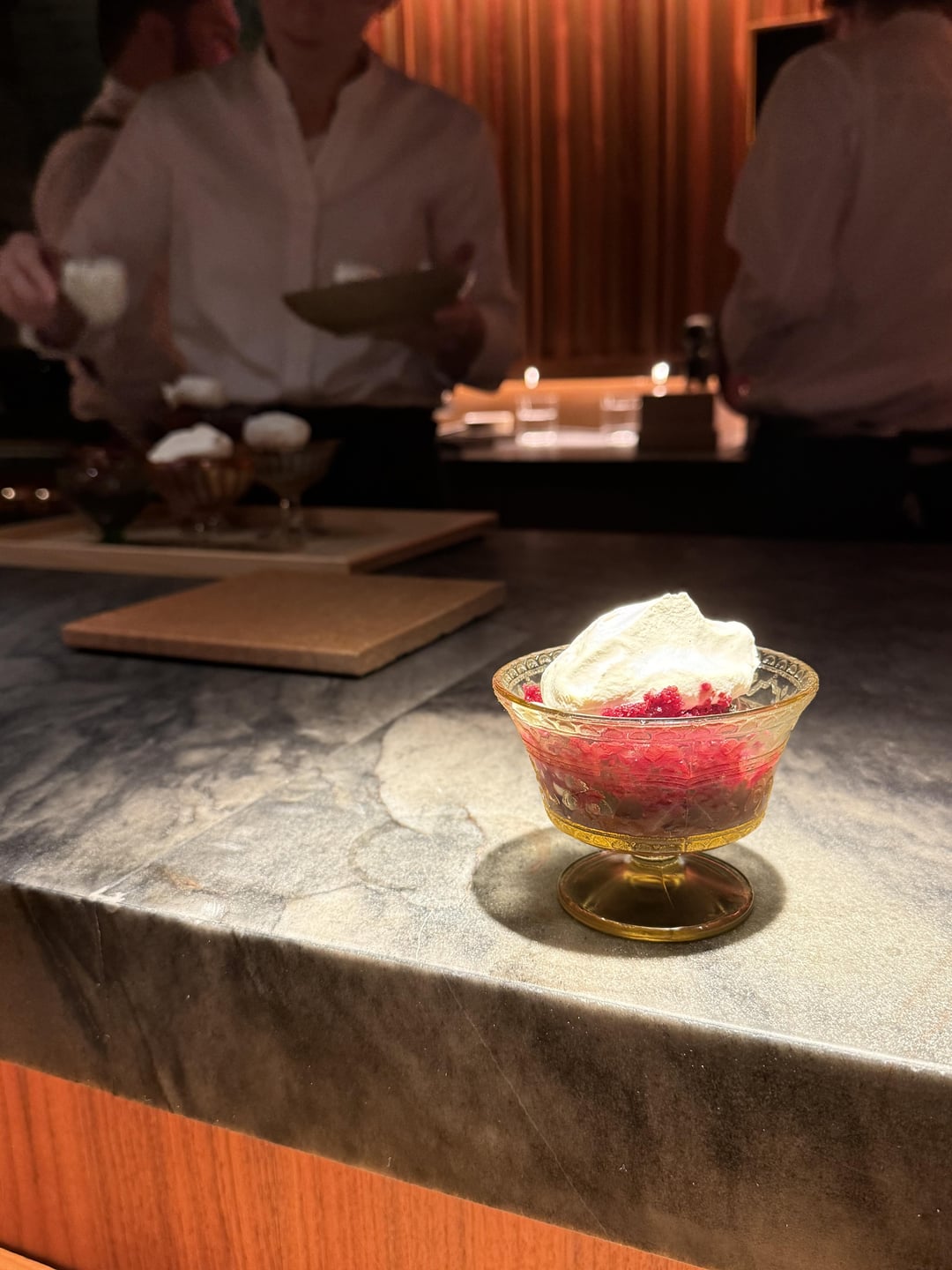 Tucked away in an alcove high above the restaurant, Clemente Bar and Studio sits with a bird’s eye view of both the iconic dining room below and park across the street. It has its own dedicated kitchen, which two incredible chefs were brought up from downstairs to run: counter chef Mariana Schurt and junior sous Michael Herro. It was designed in collaboration with Francesco Clemente whose art is hand painted on walls and ceilings, so the beauty of the space pairs perfectly with the beauty of the food, pairs perfectly with the beauty of the team. Everything was orchestrated by an engaging cast who all expressed genuine excitement about what they were doing, where they were doing it, and who they were doing it for. Will Guidara’s hospitality of presence is far from forgotten here.