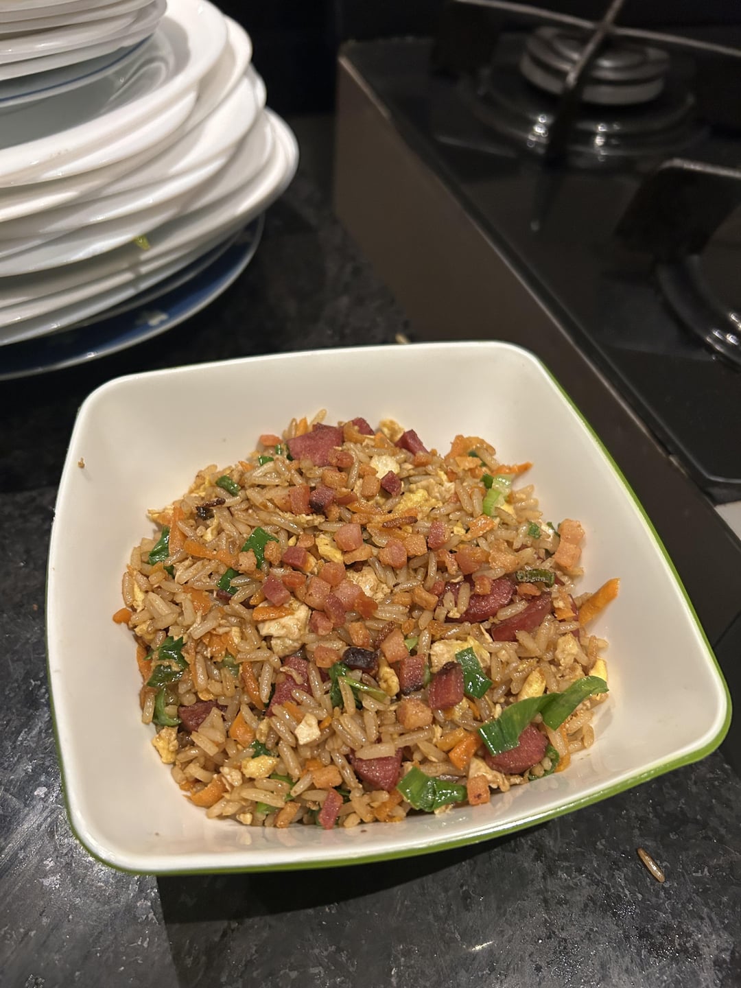 Decide to use some left over rice to cook some fried rice. Used light soy sauce, some butter, water, oyster sauce, smoked sausage, scrambled eggs, scallion, shaved carrot and some bacon (cooked the bacon for last so it would be crunchy).
