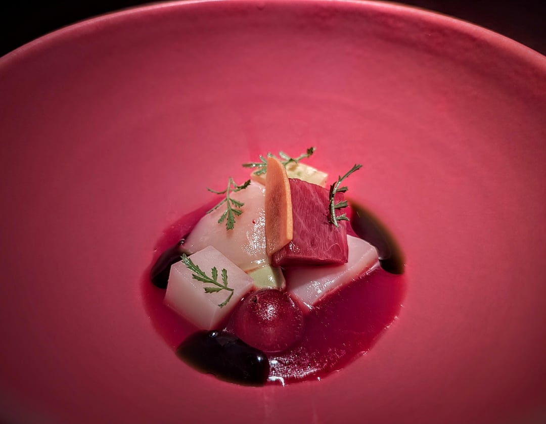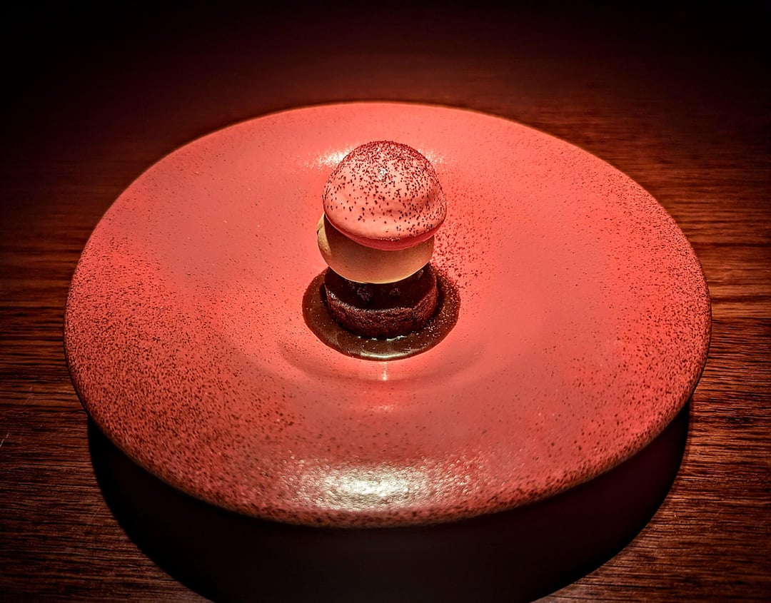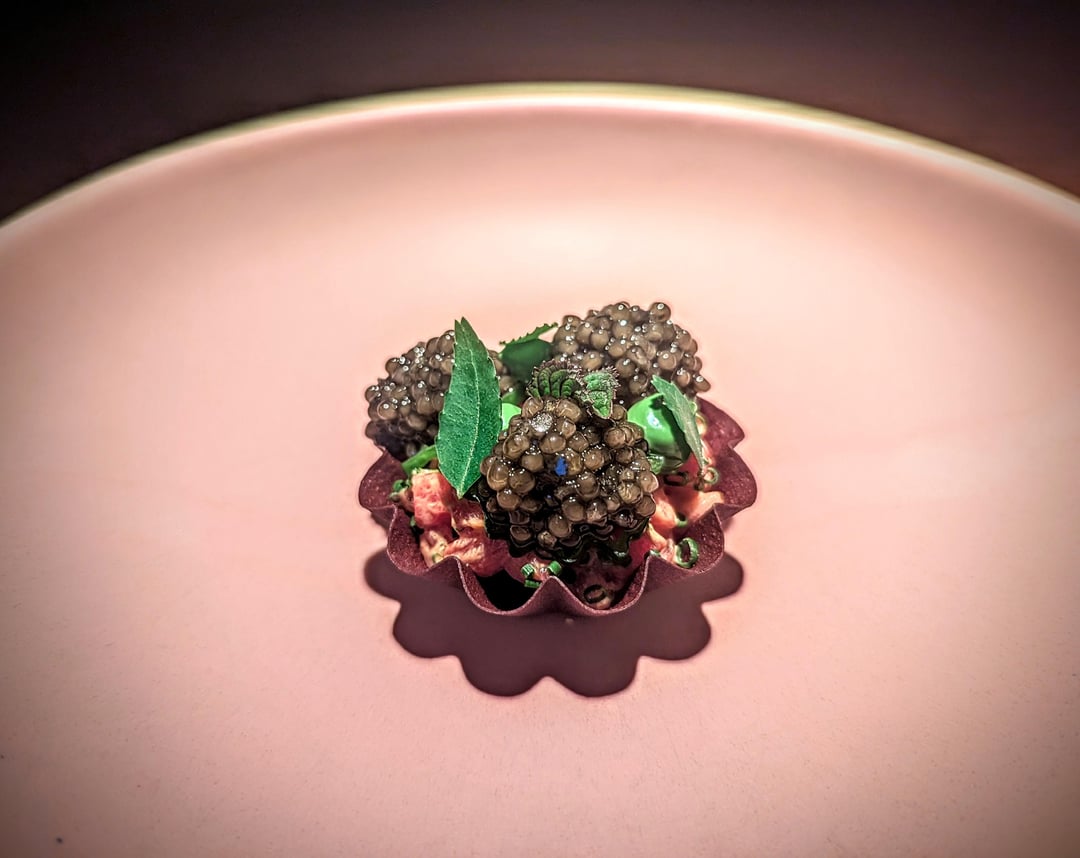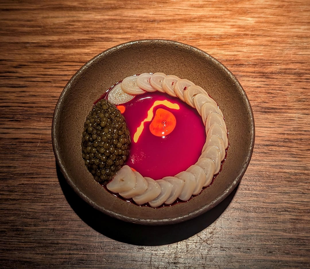 This gripe aside, the food is stunning. Aesthetically of course, as I hope the pictures highlight, but also in the composition of flavours. There were only two dishes that I considered not up to par: the 120-day aged beef and oscietra caviar tartlet, which saddened me because the beautiful ingredients were overwhelmed by pepper. Rather than being allowed to sing, the protein was suffocated by spice (spices feature in almost every dish at Ikoyi, but this is the only example where the spice was unbalanced with respect to the other ingredients). The other dish that did not compare to the savoury courses that preceded it was the first sweet course, the cherry and vanilla, where the tartness of the cherry was not adequately balanced against (a milk of some sort would have been welcome).