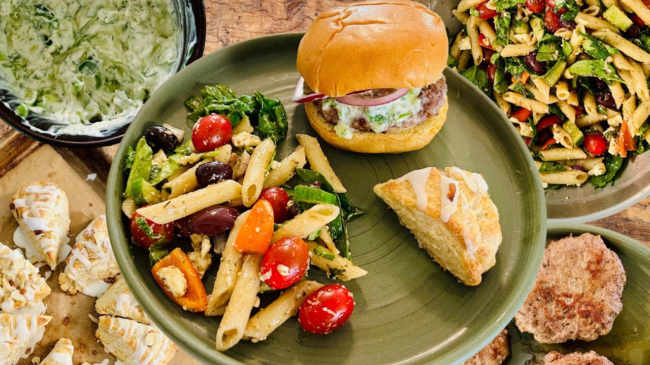 Ground lamb seasoned with sage, oregano, onion powder, and garlic salt, pan-seared and served on a brioche bun with homemade taziki sauce. Fresh Greek pasta salad with tomatoes, sweet peppers, red onions, cucumbers, olives, spinach, and feta cheese, dressed in a homemade vinaigrette. Homemade sourdough discard almond scones, with an almond glaze and topped with sliced almonds.