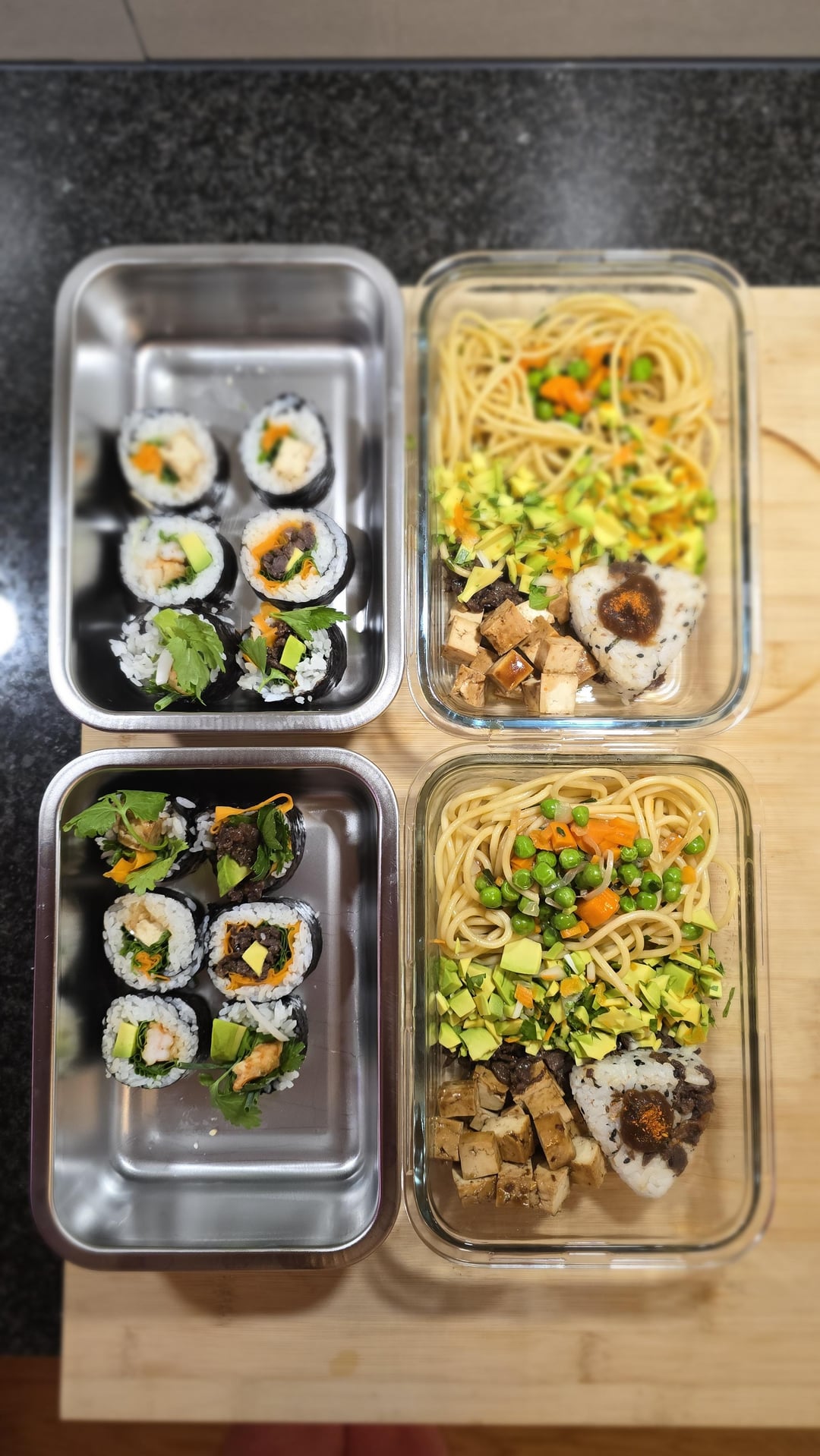 A spontaneous idea to make something like sushi at home with the groceries I had. But I didn't have any high-quality fish at home. It's filled with marinated tofu, soy beef, shrimp with avocado, spring onions, carrots, and various herbs.