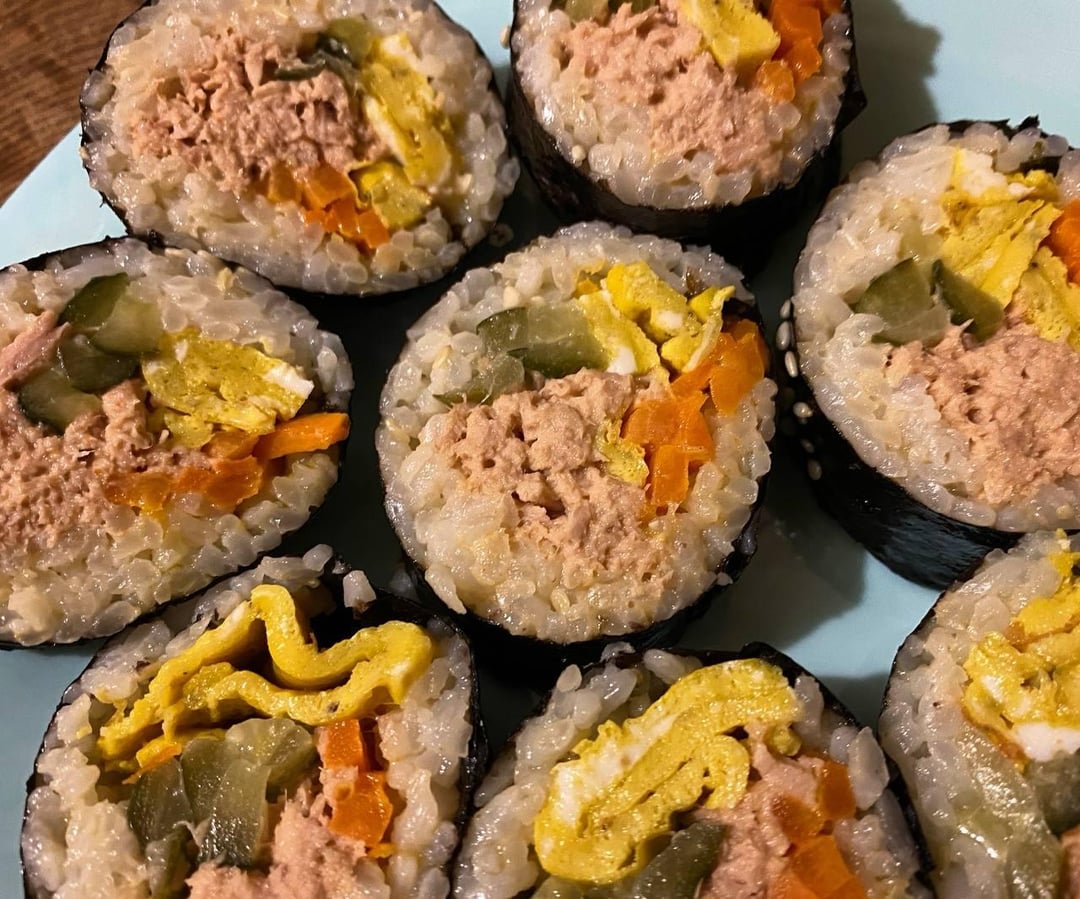 And inside we have gochujang-mayo tuna, fried carrots, soy sauce omelette and… pickles! I didn’t have danmuji, so I decided to substitute its flavor by sweet and sour crunchy cucumbers. But I’m going to get this cute yellow radish next time, I swear 😀