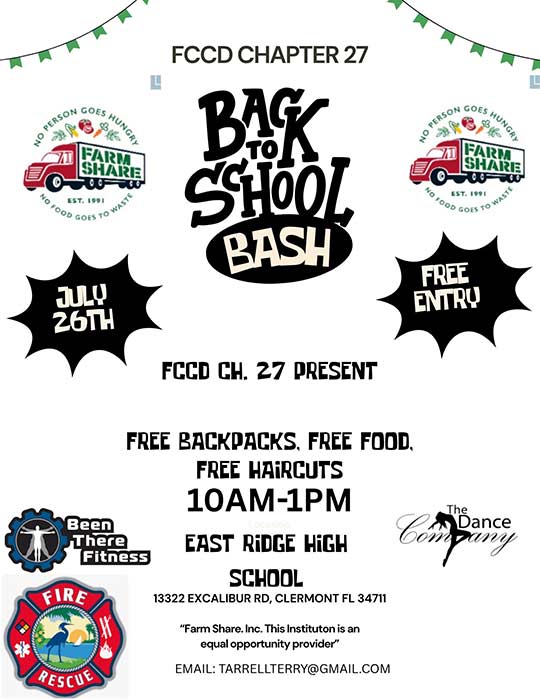 The FCCD Chapter 27 is once again stepping up to support the community with his 3rd Annual Backpack and Food Drive, set to take place on Friday, July 26, from 10:00 am to 1:00 pm at East Ridge High School in Clermont.