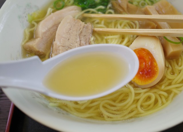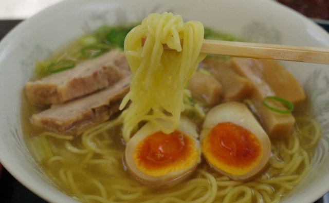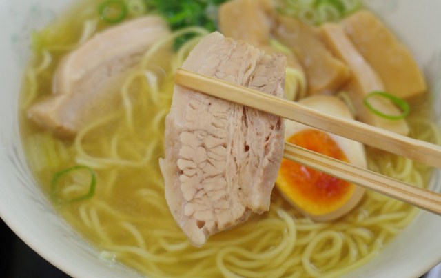 The ramen, which had a shio, or salt-based, broth, was presented beautifully, with a chunky slice of pork, menma (bamboo shoots), a seasoned boiled egg, and green onions.