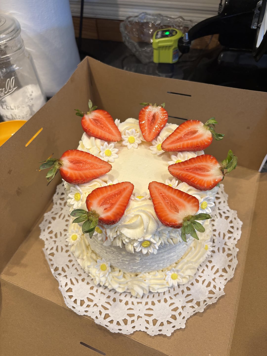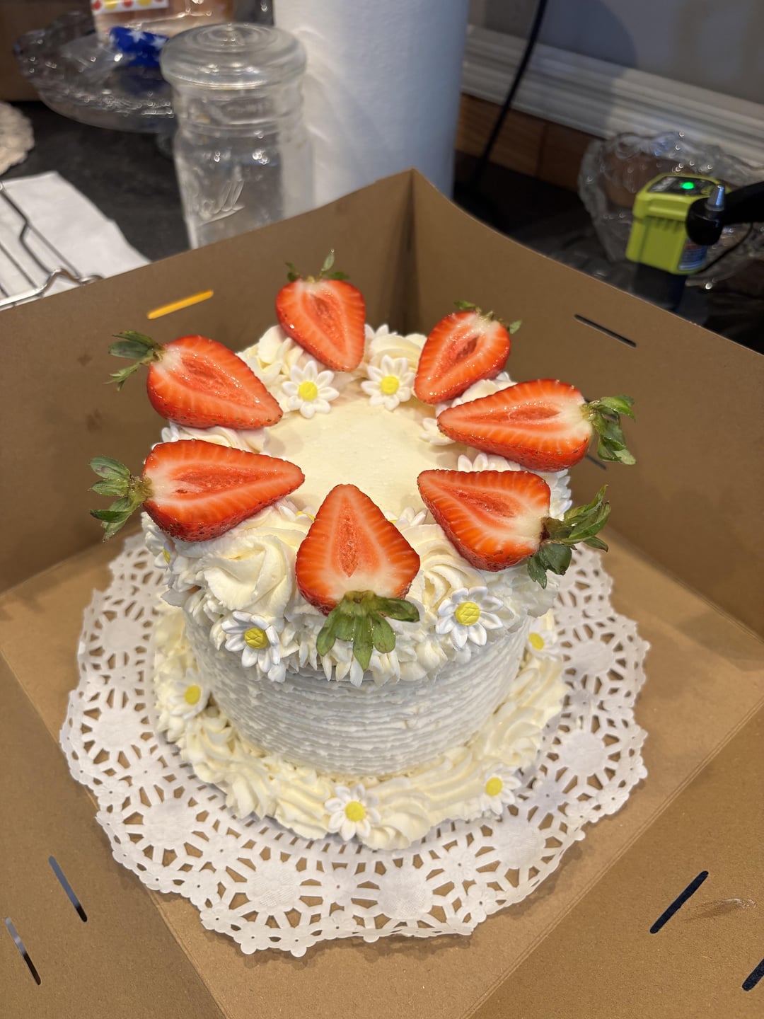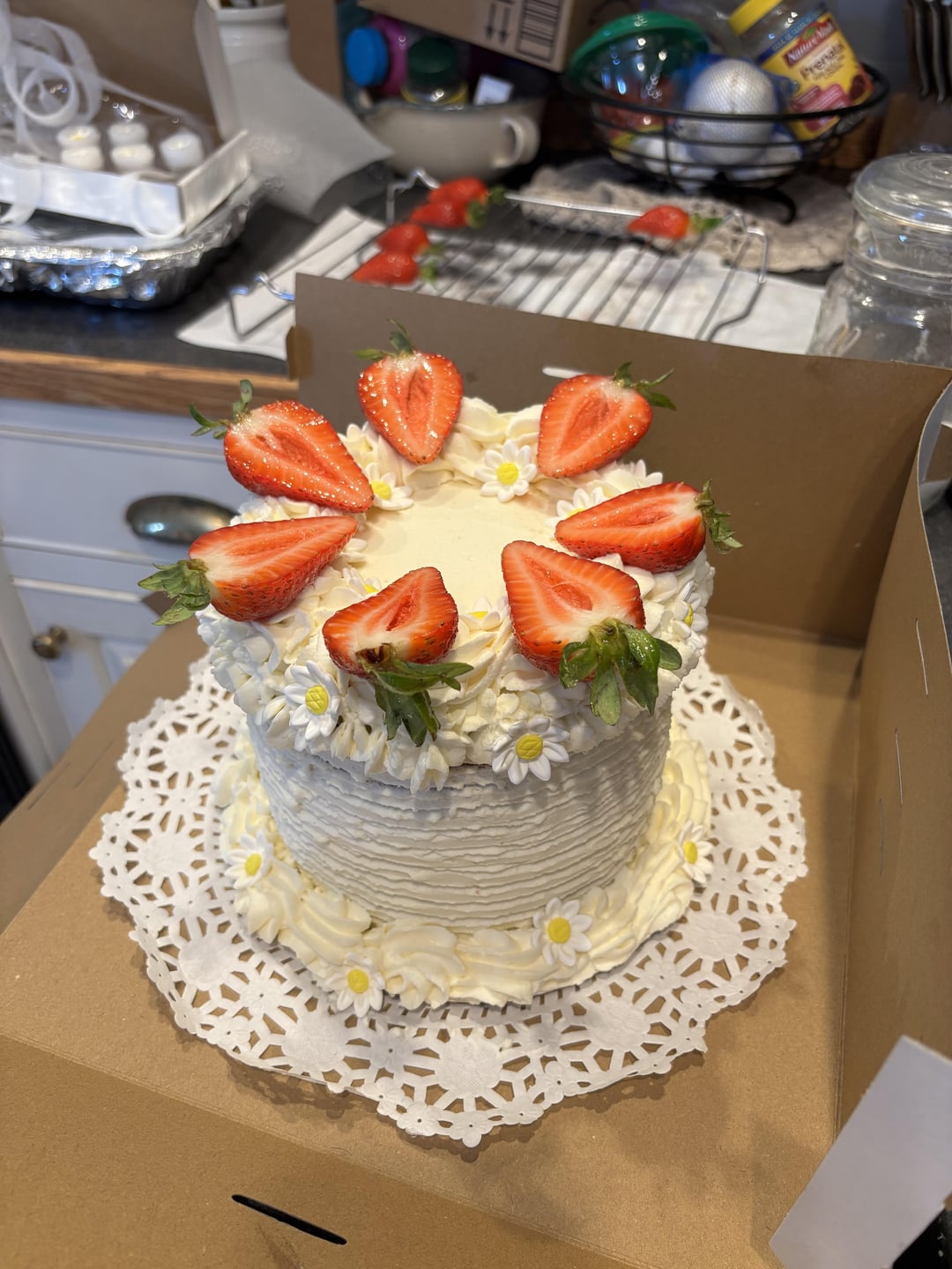 I love how this came out. It’s for my first customer, for her wedding. It’s a strawberry shortcake with strawberry glaze in between the layers, a mascarpone whipped cream frosting, and fresh strawberries dipped in pectin and little candy daisies. I’m so excited for her to get it for her big day !!