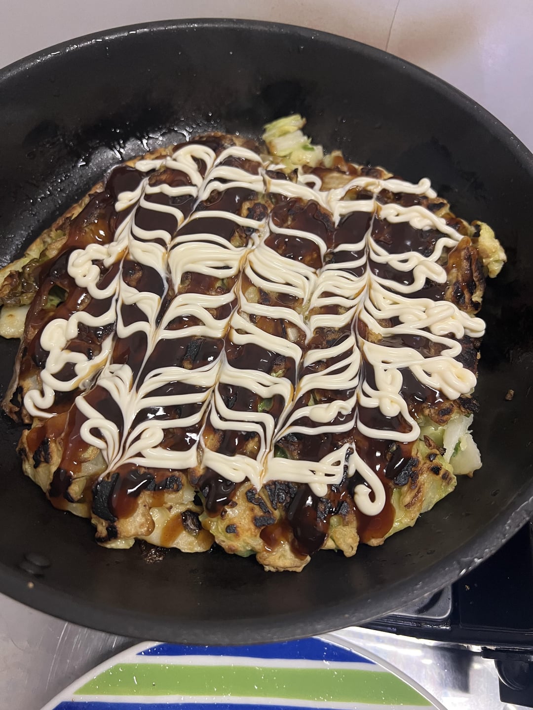 I knew it was okonomiyaki even from the thumbnail because of that mayo pattern! I’m partial to Hiroshima style. Really need to find a good sauce here in the States (or learn to make my own).