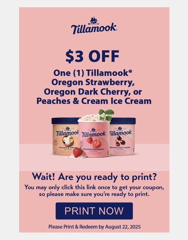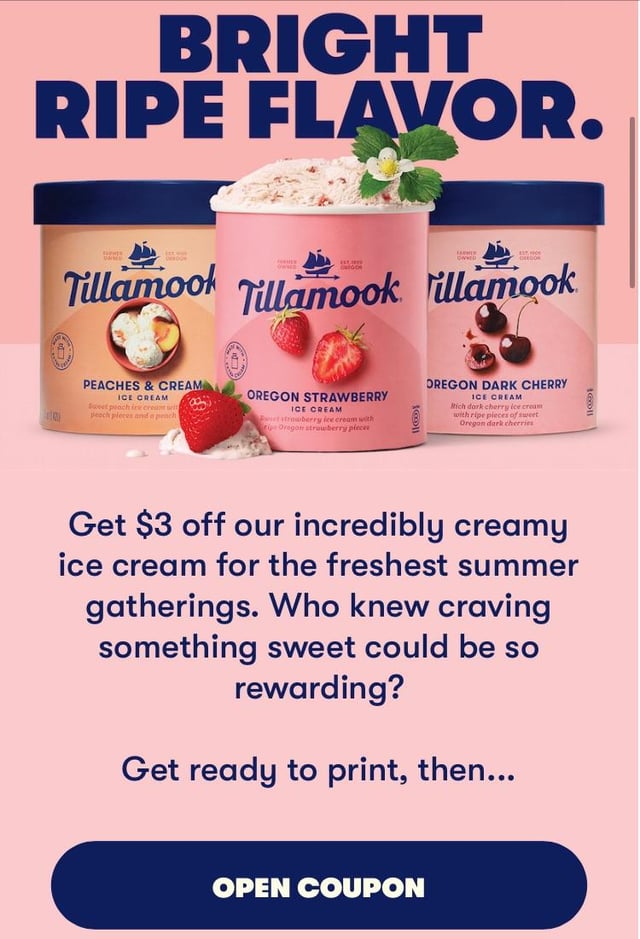 Hi I’ve been signed up to Tillamook email newsletter for about a year now. This is the first time I’ve gotten a coupon. It’s a print only coupon for $3 off three specific flavors: strawberry, dark cherry, peaches and cream.