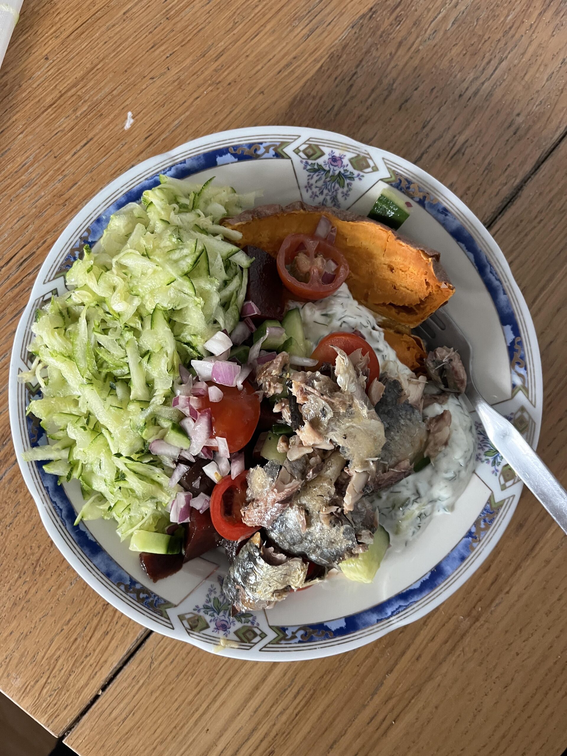 zucchini beets red onion cucumber beets tinned sardines sweet potato and homeade nonfat tzatziki