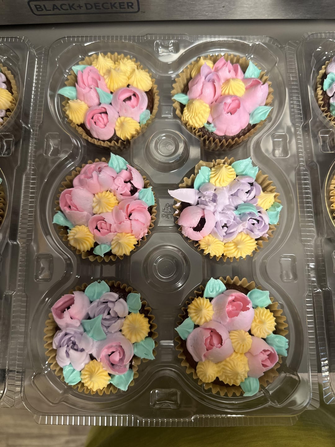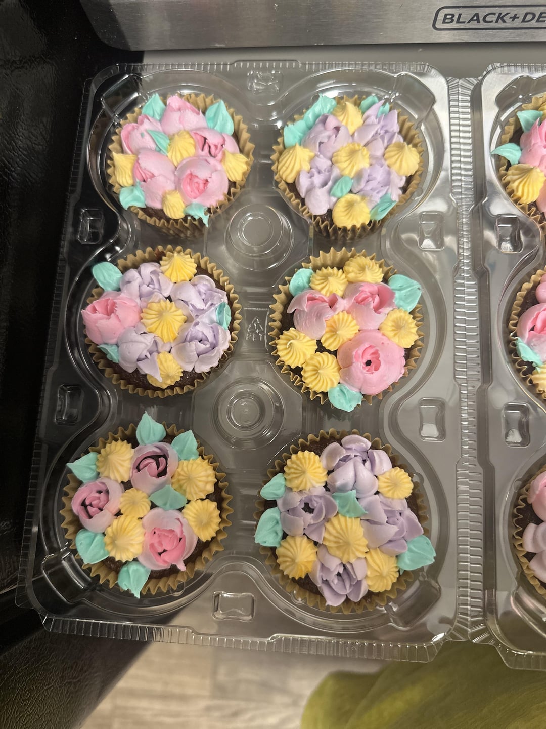 We use this tip at my bakery. We don’t really frost the cupcake before, but we do a small pillow of frosting in the center, and then do the flowers over top and on the sides of that pillow. This creates more dimension for the bouquet. We also definitely add more leaves, you can kinda go crazy on the leaves honestly. Bouquets are supposed to have greenery, it doesn’t look out of place with lots of leaves! And you get the added bonus of being able to cover any empty spots on the cupcake 🙂