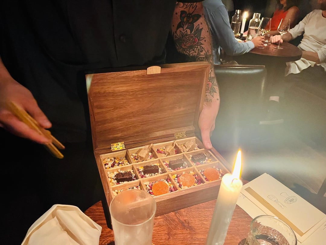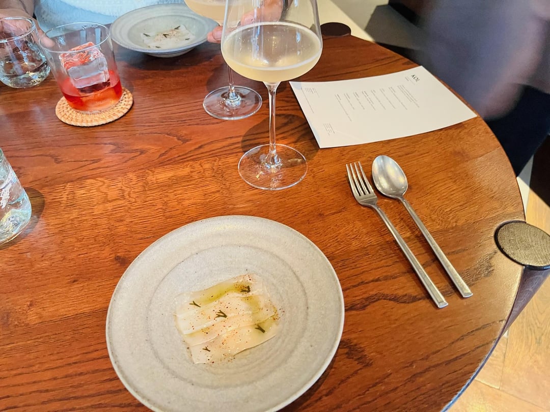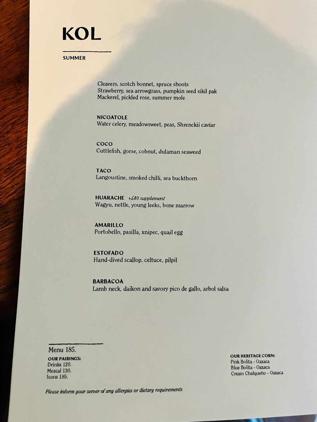 We had the £185 menu for two. So I think that came to about £400. And then it's whatever drinks you have on top. So I think there was an extra £400 on drinks (3 cocktails, 1 glass of dessert wine, lots of non-alcoholic cocktails and a bottle of sparkling non-alcoholic something, She said it was a kombucha, but it was very mild, as I don't usually like kombucha, and this one was very good. Maybe it's because they made it sparkling as well, that helped.)