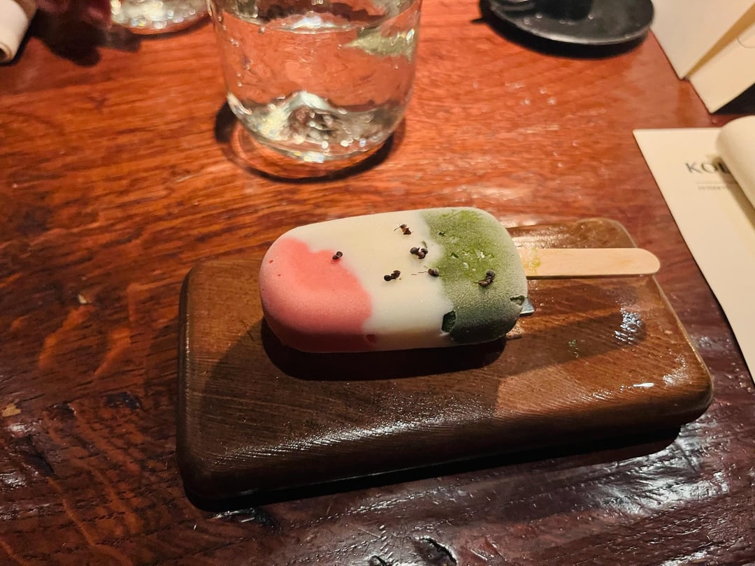 This is the silly one that everyone will photograph. It is quite cool, and you can't necessarily taste the ants. They're a little bit tangy. This would stand alone by itself without the ants, but it is also extremely fun to have them on there and works really well. I'm also quite biased here because jalapeno is one of my favorite things in the whole world, so you can't trust my opinion on this. I would eat a jalapeno ice lolly most days if I could.