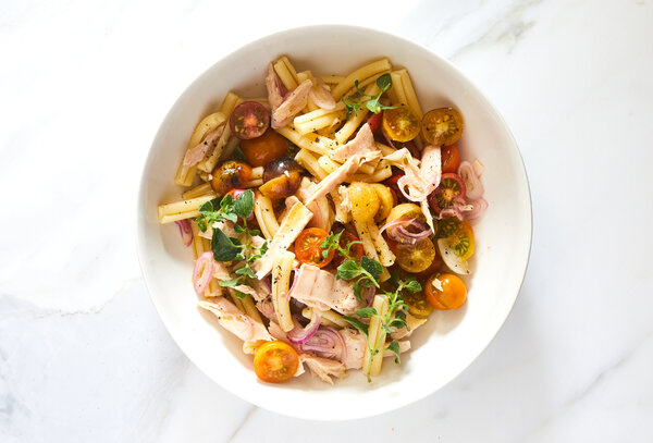 - Stir in flakes of tuna and serve with a drizzle of olive oil on top. The pasta can be served hot or at room temperature.
