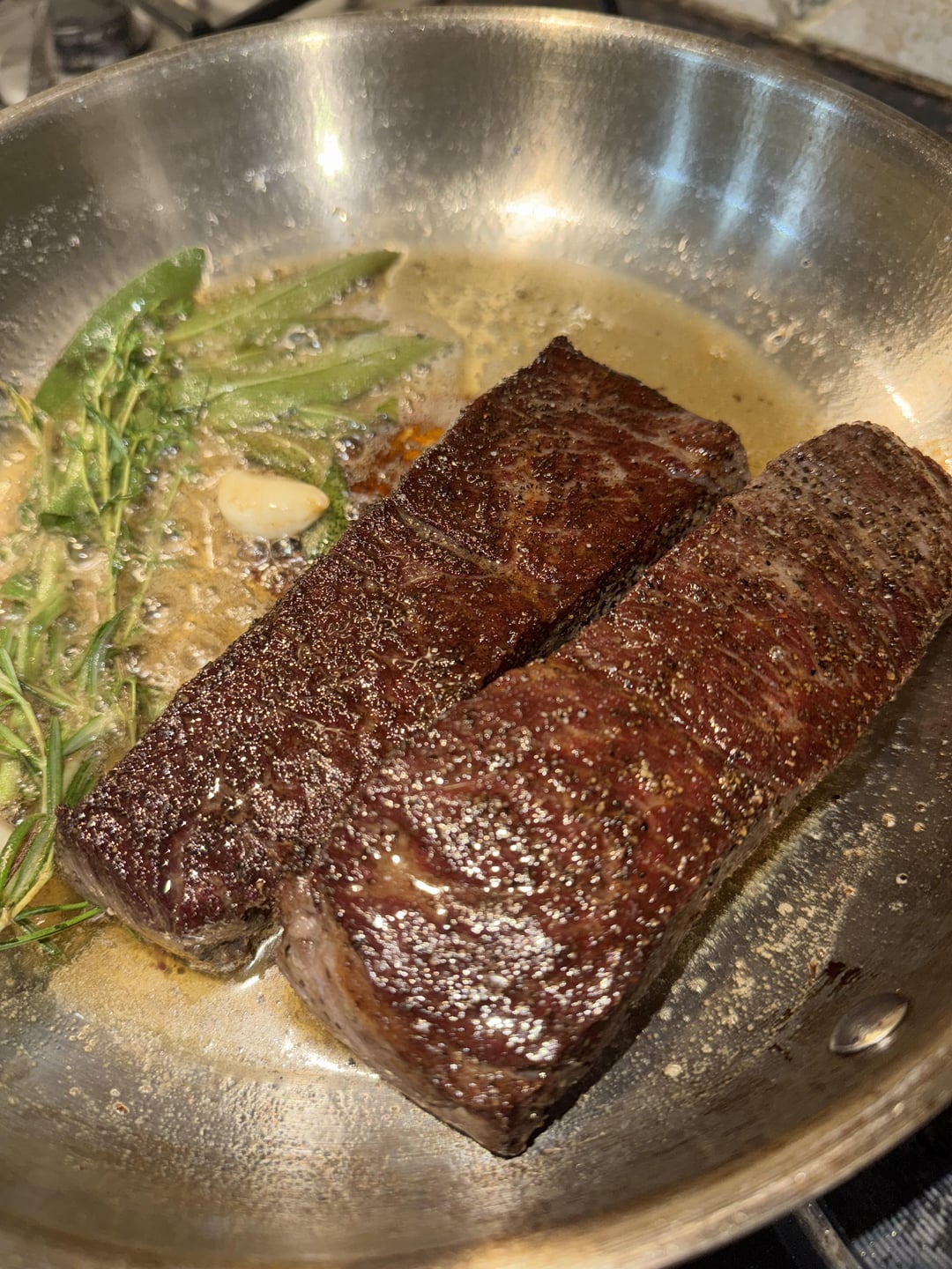 i seared on both sides for 3 mins then on the smaller sides for 60 secs each then basted in butter with rosemary, thyme, marjoram + garlic.