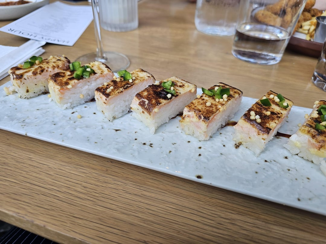 Seeing as you are at an Earl’s I’m guessing there’s a decent chance you’re in BC. If you can, do yourself a favour and go to Miku or Minami for much better oshizushi aburi. Earl’s is a decent place for a chain but they are definitely not the place I’d go for sushi unless you’re in a group that wants burgers or pasta and you feel like sushi. They fill a niche but they are not top quality sushi.
