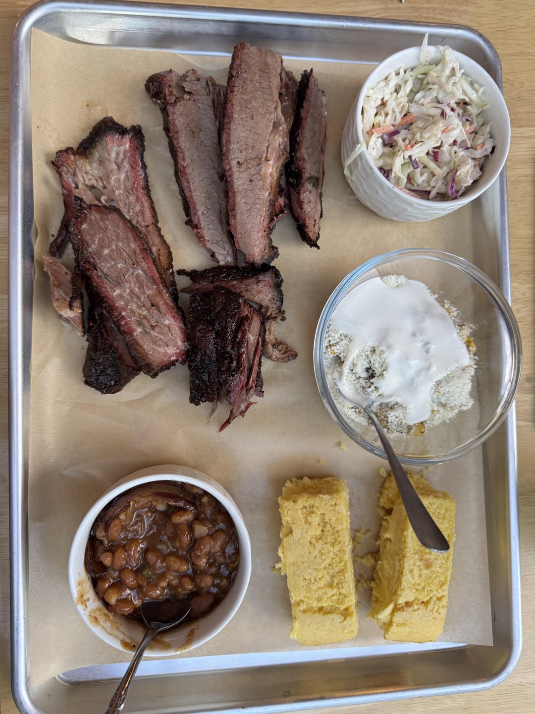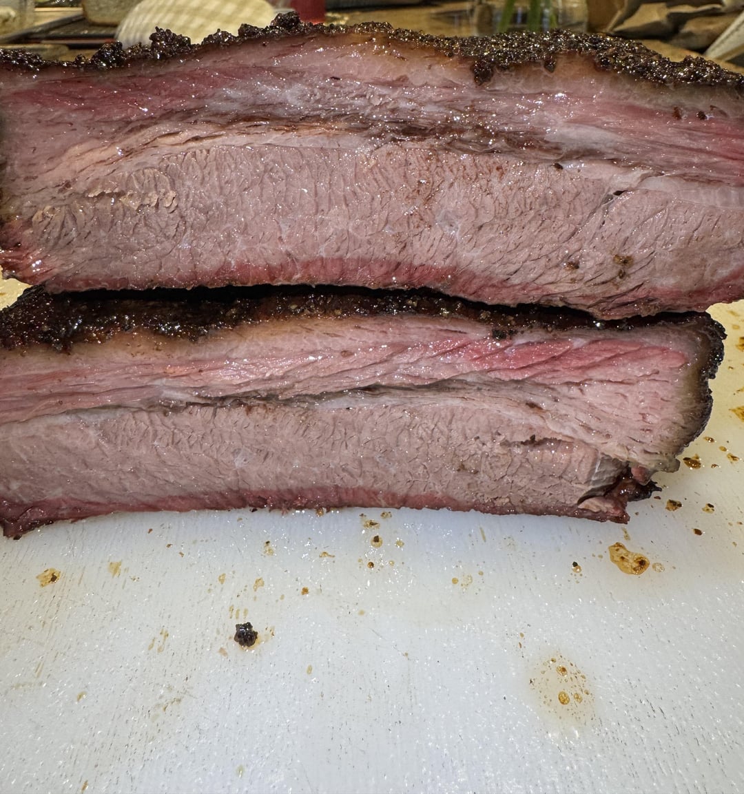 Pretty much followed Meat Church’s recipe for pellet grill brisket to a tee. Dry brined for 24hr in SPG, MSG, and Heath Riles beef rub. Put on Traeger Woodridge Pro at 9pm at 200 degrees super smoke until 9am. Let it go at 225 for a couple more hours until bark looked good. Wrapped in butcher paper and homemade tallow once temp was around 175. Bumped Traeger to 250 after wrapped and let it ride until probe tender around 203F. Poured more tallow over the paper, and set outside under my gas grill (off) to rest at ambient temp for about 40 mins to stop the cook. Then wrapped in a towel and put in Yeti cooler to rest until dinner (about 4hrs rest). First time I’ve made a brisket I’m happy with! Made all the sides too! (Homemade slaw, elote, baked beans, and cornbread)